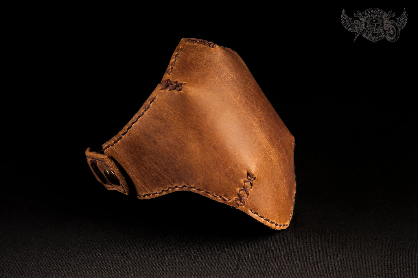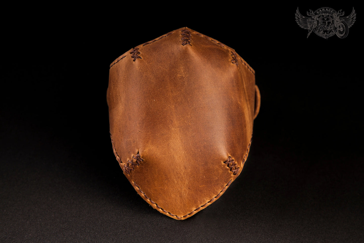 Basic Motorcycle Leather Half Mask, made with full grain leather. Inside of the mask is completely padded. We have beveled the outer edges of this half mask and burnished them with beeswax.