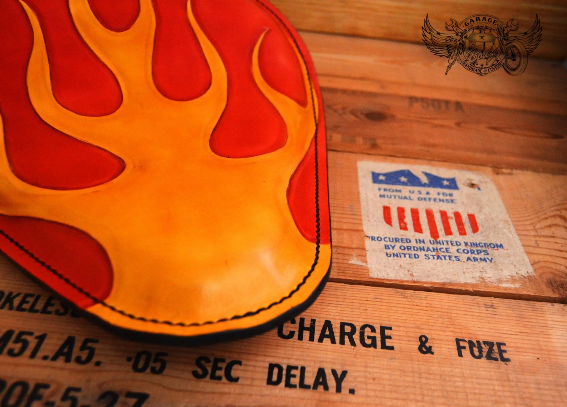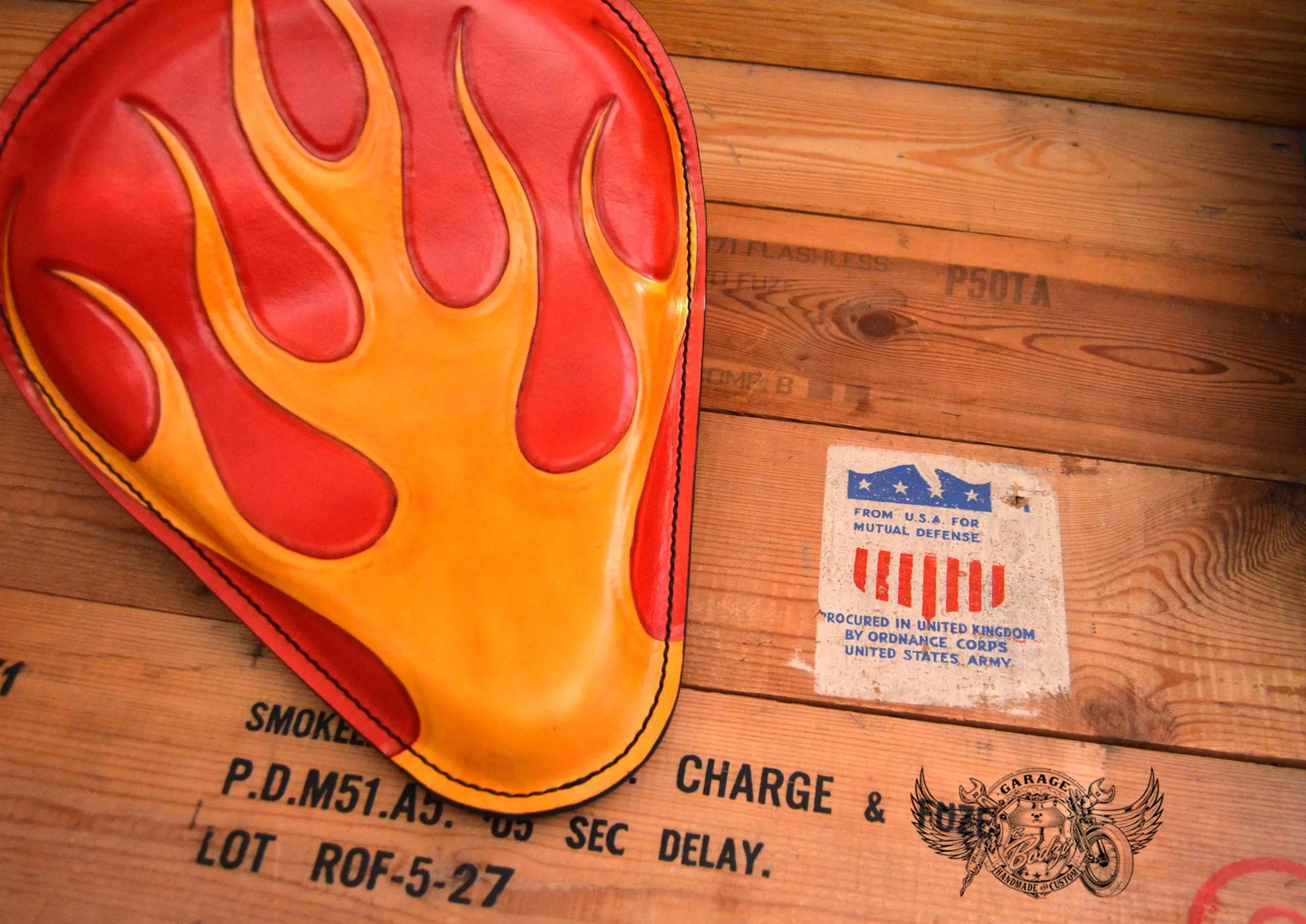 Billy Bike Tribute Leather Motorcycle Solo Seat, made with full grain leather which we hand tooled. It has carved old school flames painted in yellow on a red background. It is stitched with black waxed thread. We made the pan out of 3 mm thick steel sheets and welded M8 bolts to it.