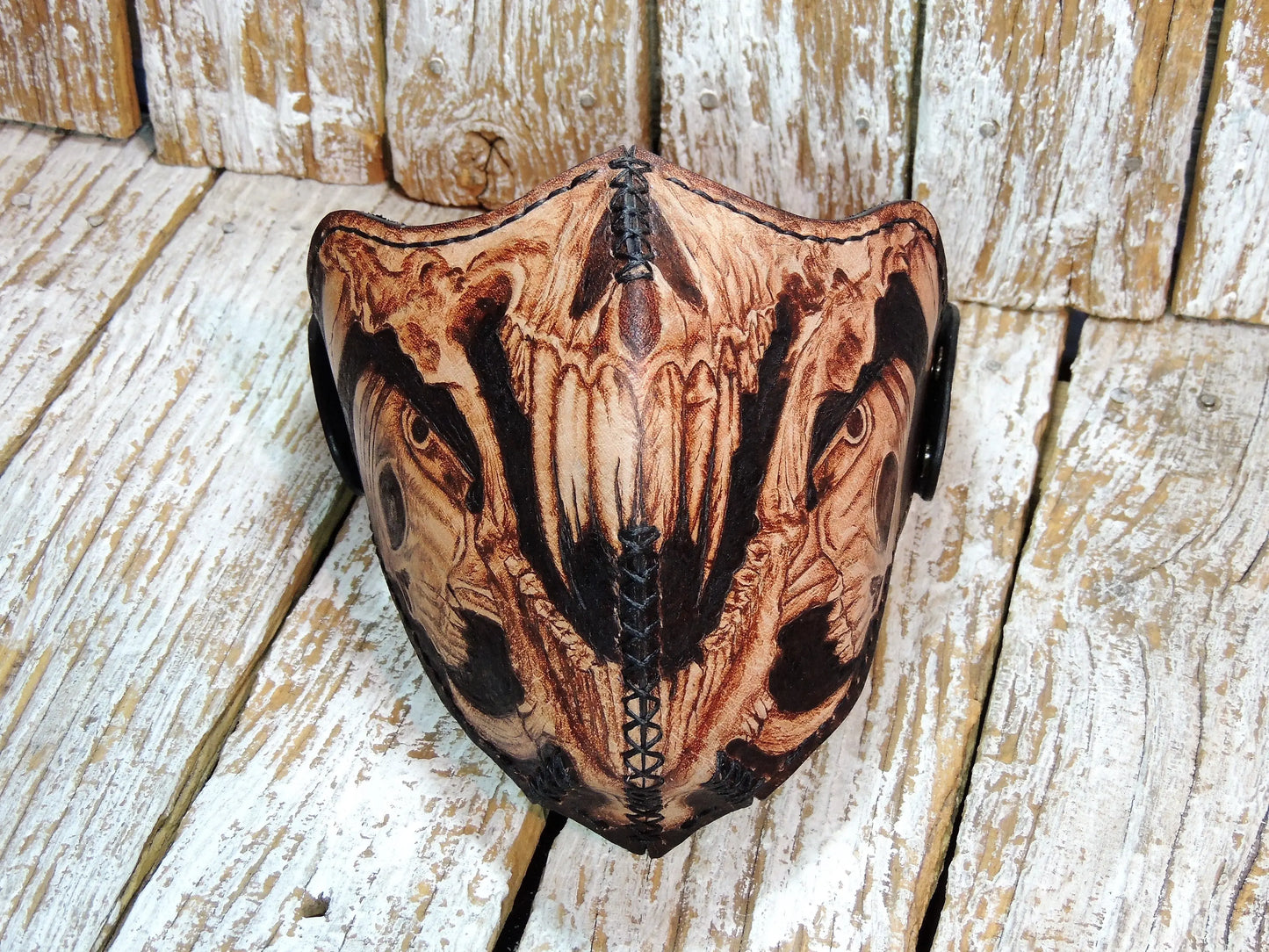 Burned Monsters Skull Motorcycle Leather Half Mask, made with full grain leather where we burned motifs. Mask is completely natural tan except the burned motifs, over time it will gain patina and darken accordingly. Inside of the mask is completely padded. We have beveled the outer edges of this half mask and burnished them with beeswax.
