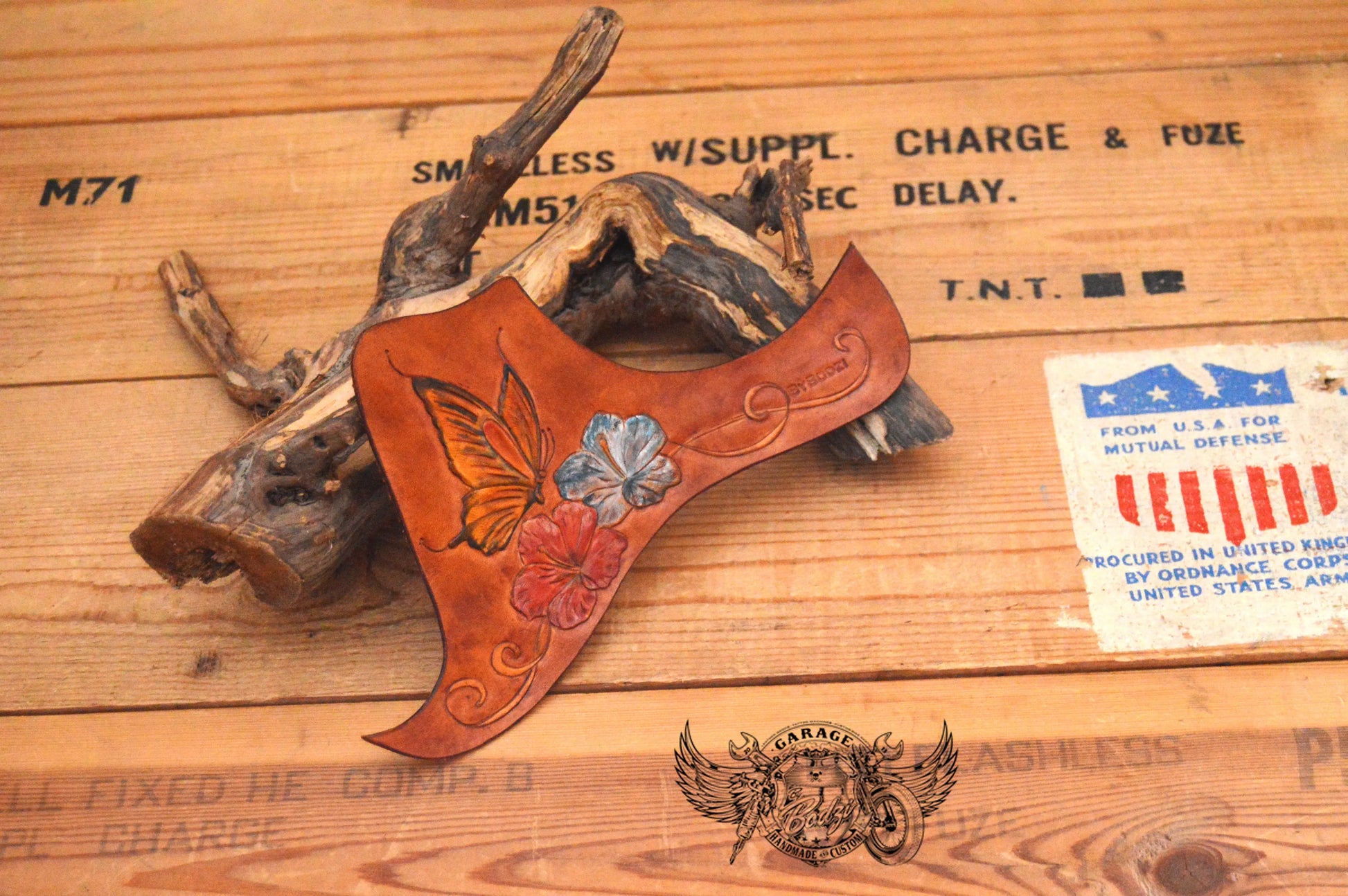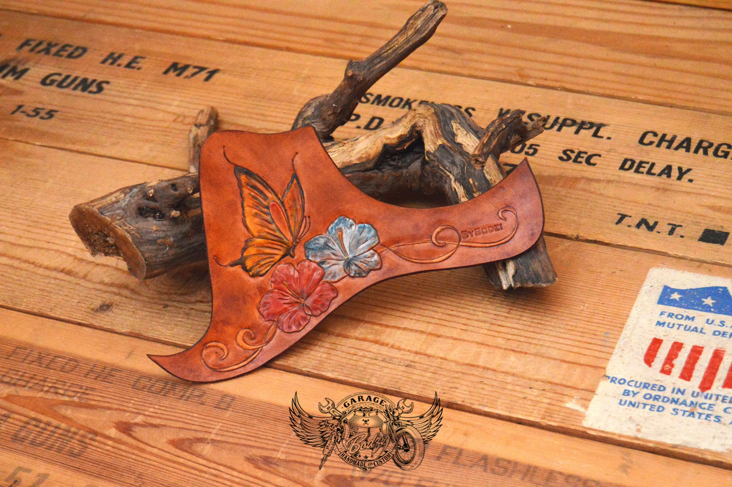 Butterly & Flowers Custom Leather Taylor Pickguard, made with full grain leather which we hand tooled. A single butterfly with a couple of flowers and some vines which we tooled and fully painted. We have beveled the edges of this pickguard and burnished them with beeswax.