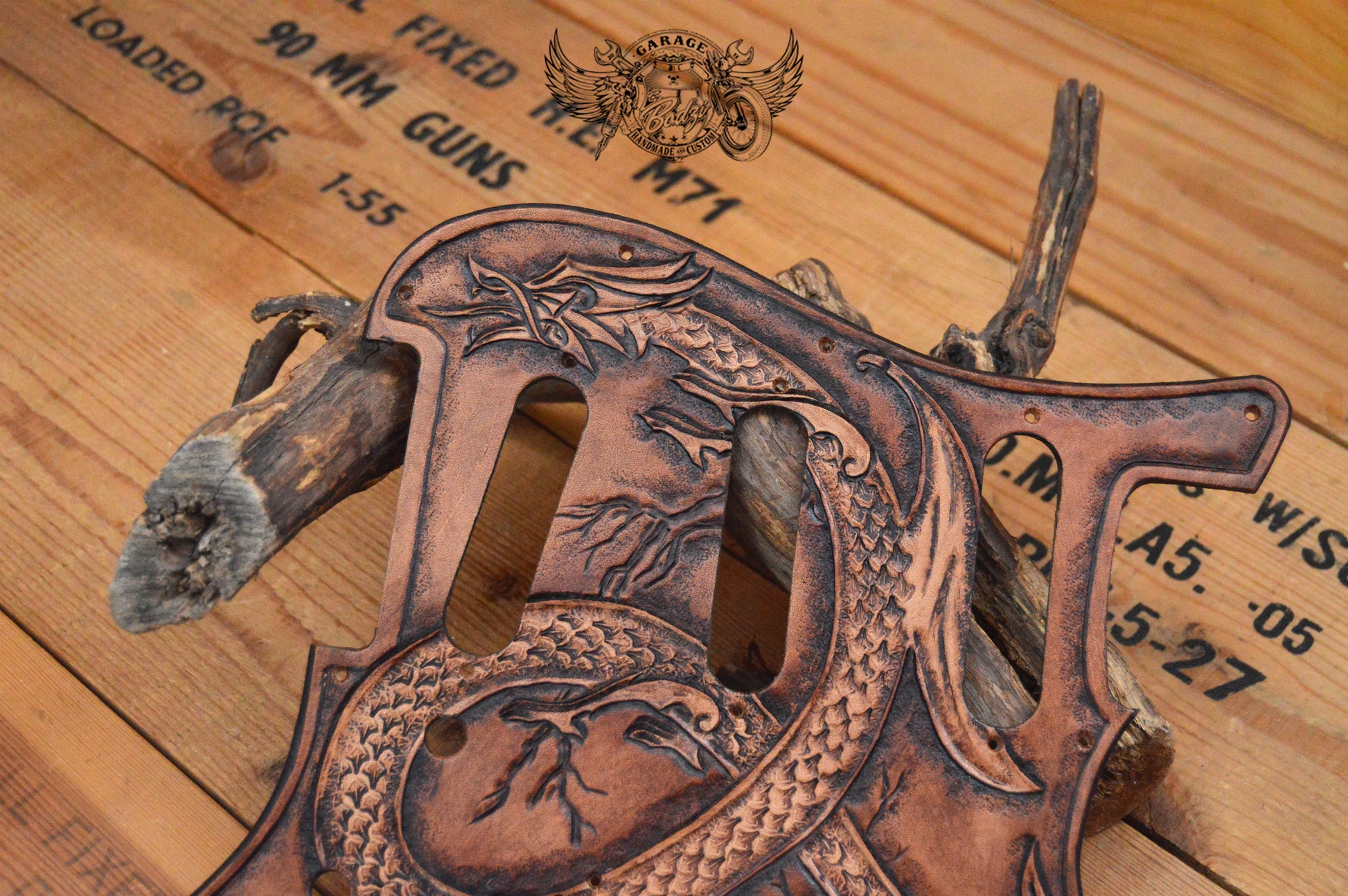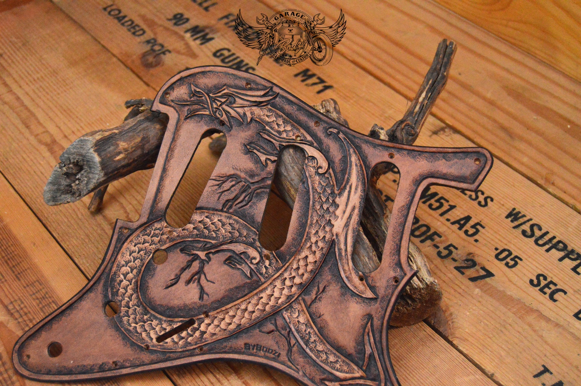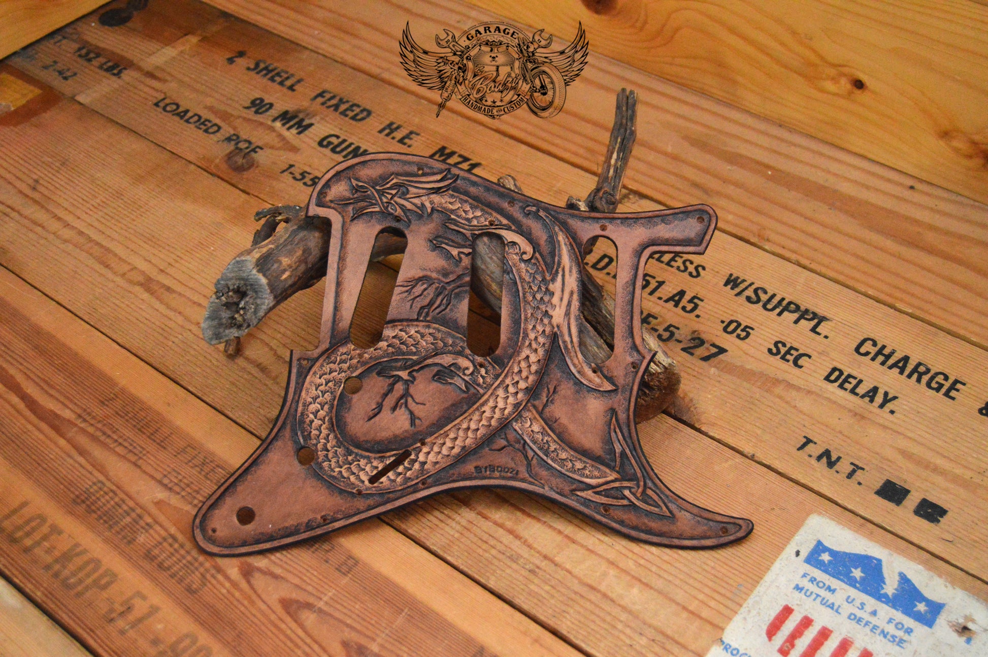 Celtic Dragon Leather Stratocaster Pickguard, made with full grain leather which we hand tooled. We have tooled a celtic dragon which we painted mostly brown with antique finish and some black shading. We have beveled the edges of this pickguard and burnished them with beeswax and added some hard backing.