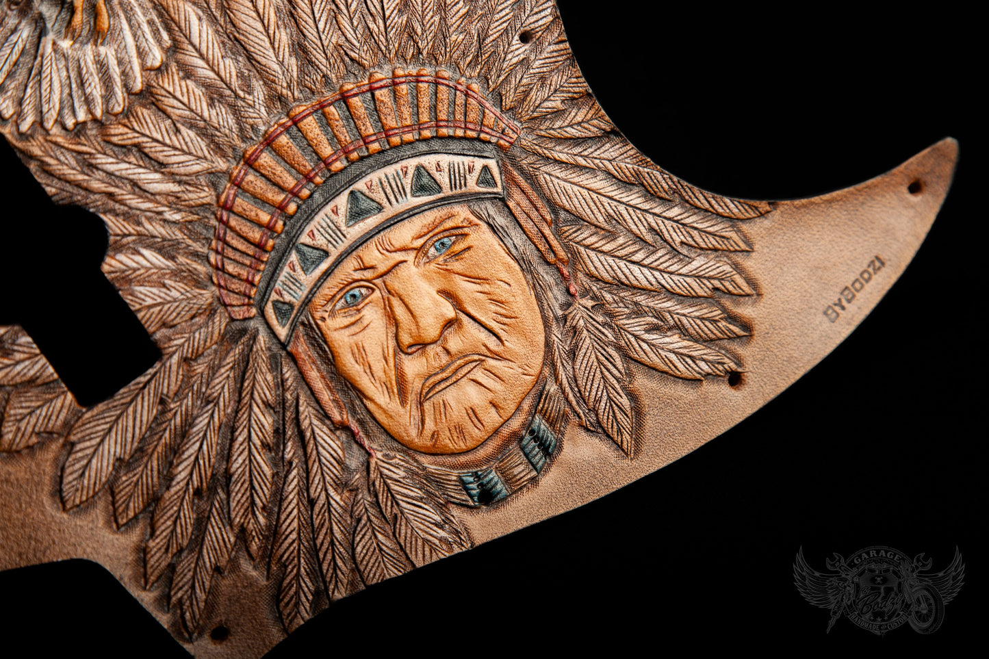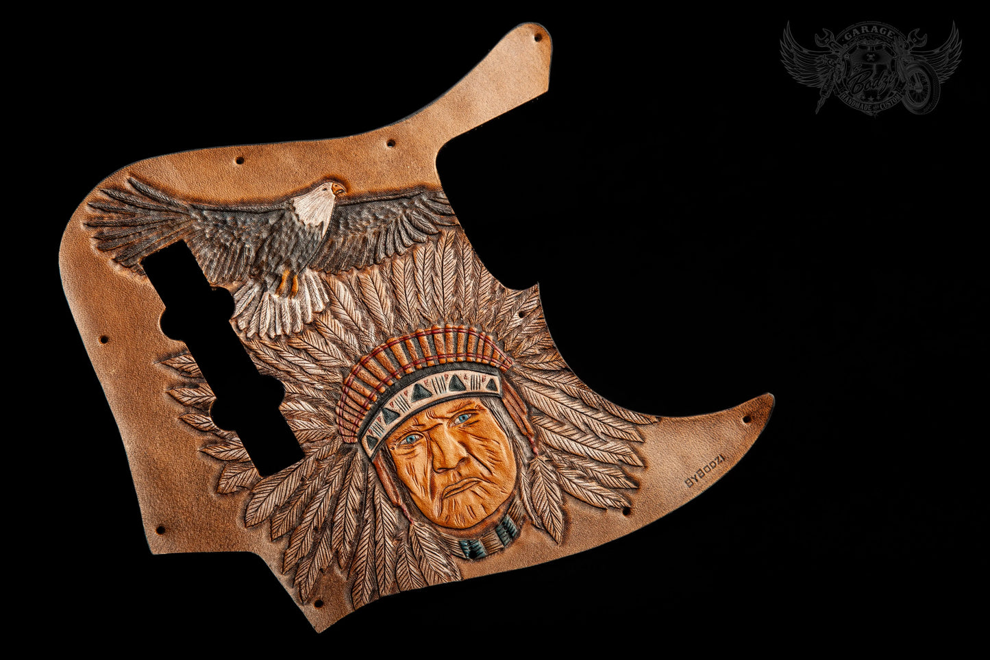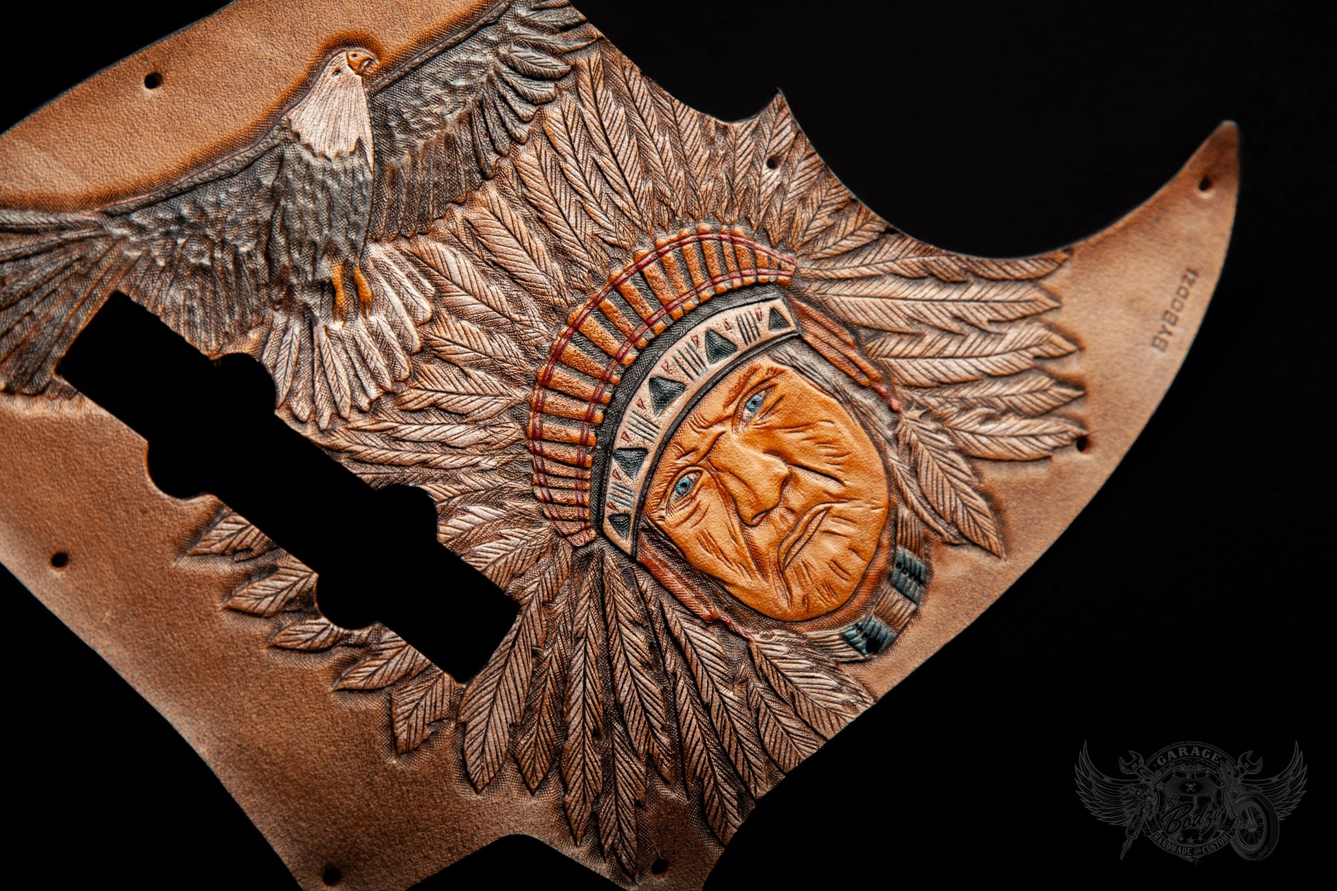 Chief Leather Fender Jazz Bass Pickugard, made with full grain leather which we hand tooled. Fully painted motifs which we tooled on a lighter brown background. We have beveled the edges of this pickguard and burnished them with beeswax and added some hard backing.
