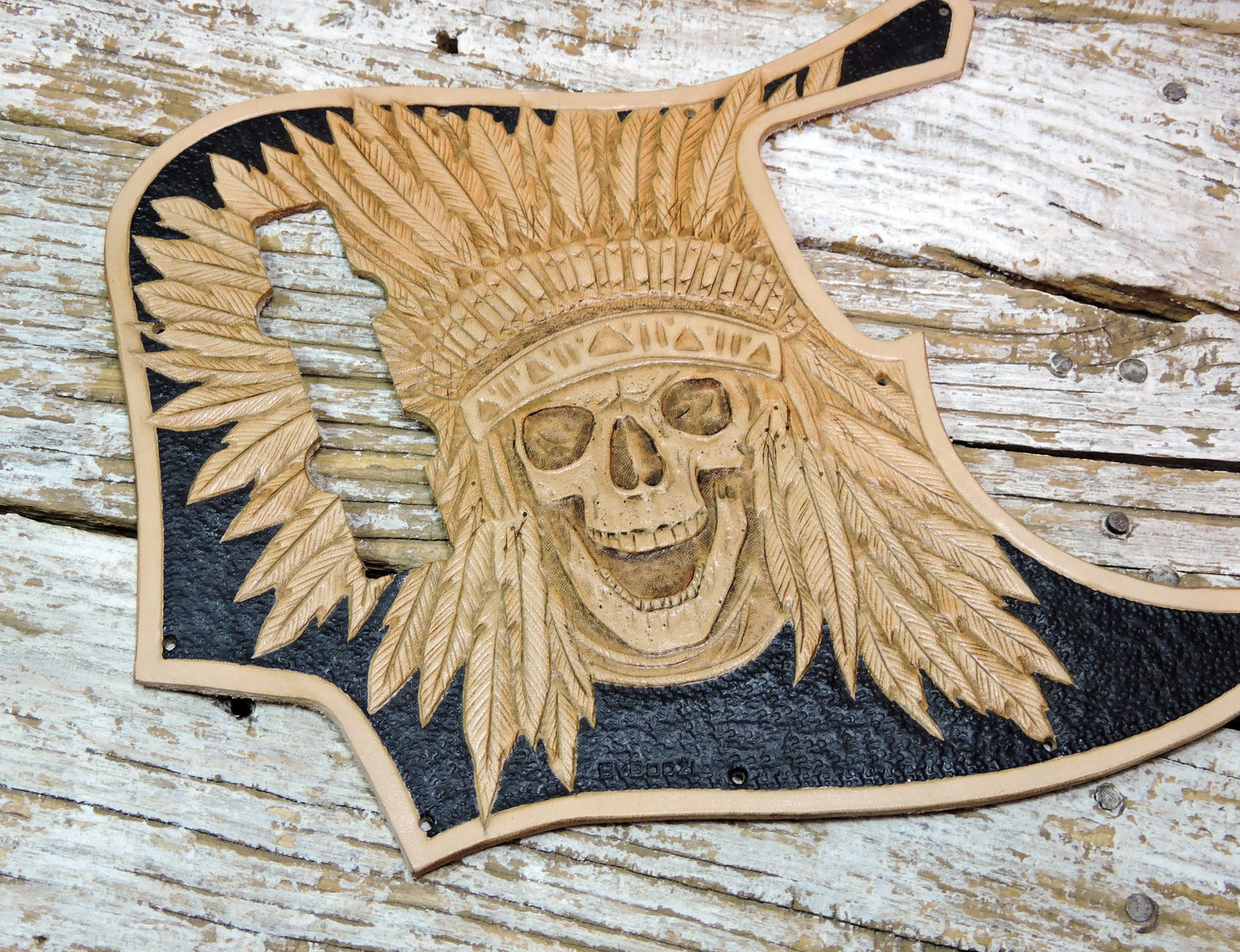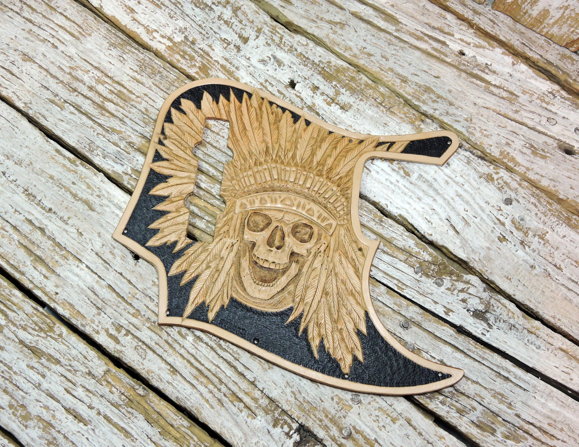 Chief Skull Leather Fender Jazz Bass Pickugard, made with full grain leather which we hand tooled. We've left the tooling completely tan while the background is painted in black. We have beveled the edges of this pickguard and burnished them with beeswax and added some hard backing.