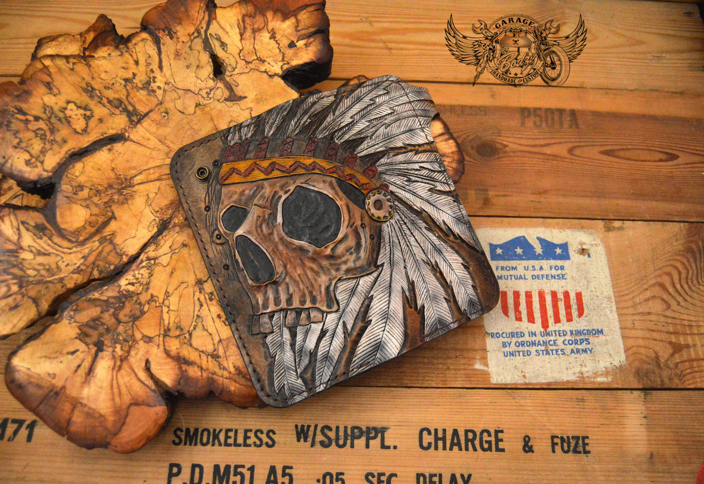 Chief Skull Leather Long Leather Wallet, made with full grain leather which we hand tooled. We have tooled a skull with a headdress which is fully painted with antique finish. This wallet comes with a hand crafted concho which is engraved. We have beveled the outer edges of this wallet and burnished them with beeswax.