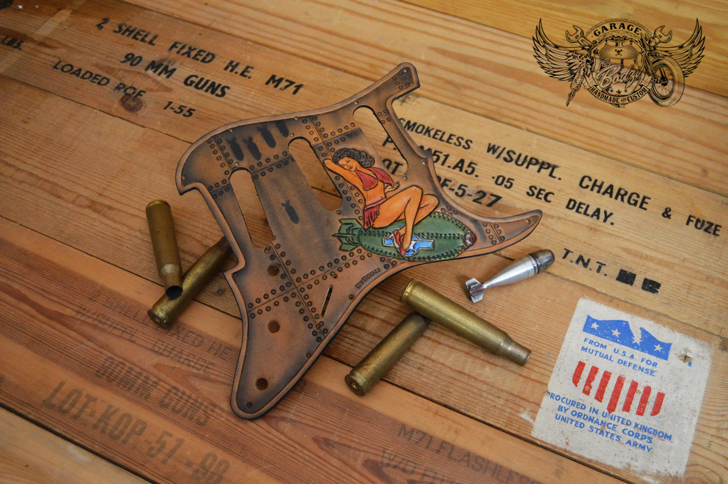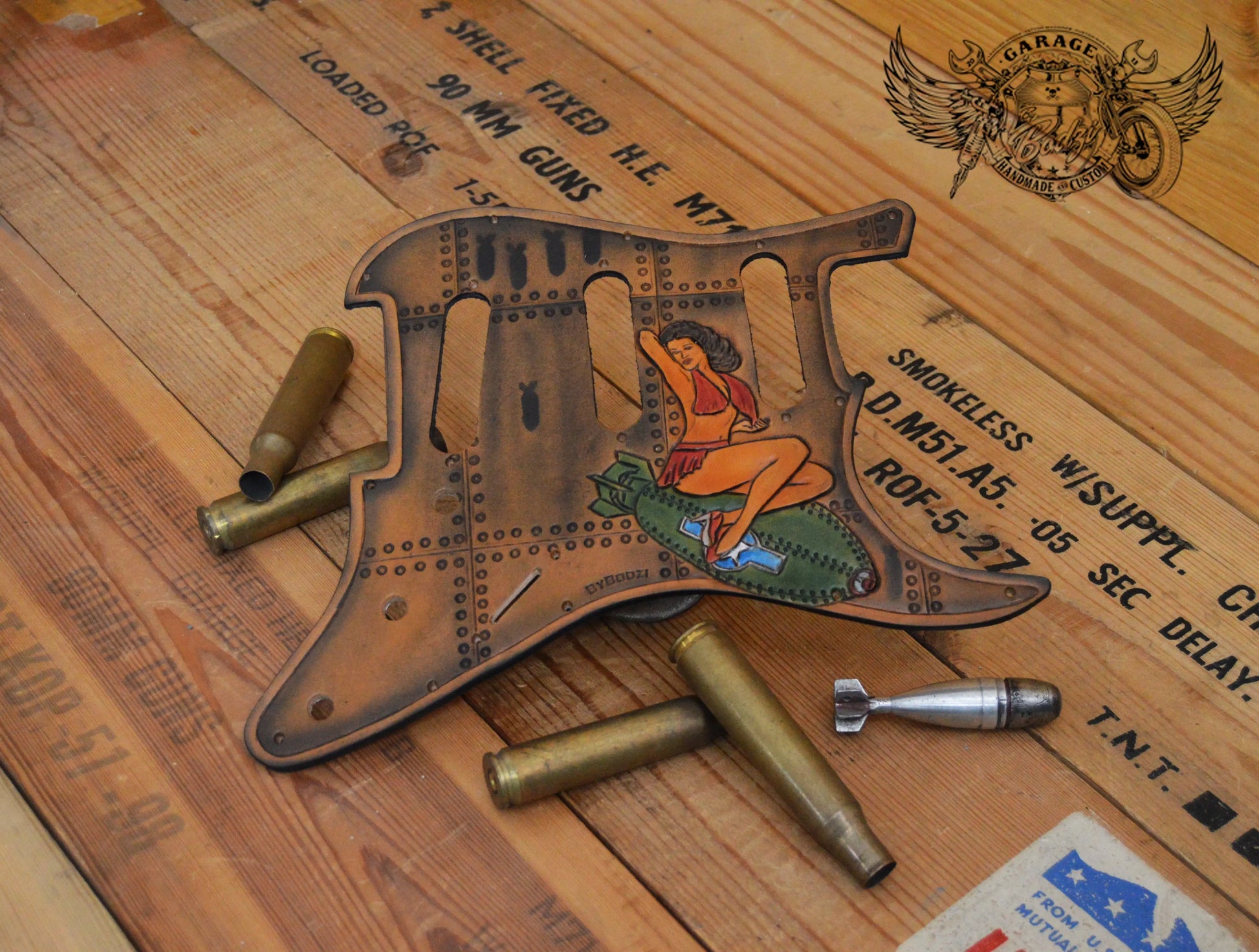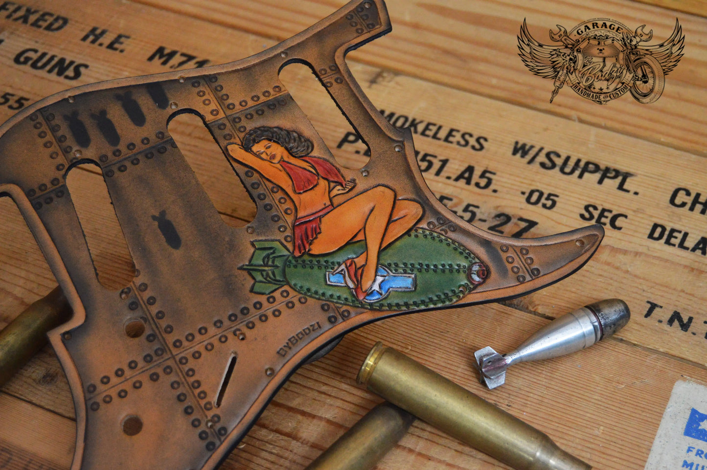 Death From Above Pin-Up Leather Stratocaster Pickguard, made with full grain leather which we hand tooled. We dye this pickguard in brown with black shading mostly with fully painted pin up girl. We have beveled the edges of this pickguard and burnished them with beeswax and added some hard backing.