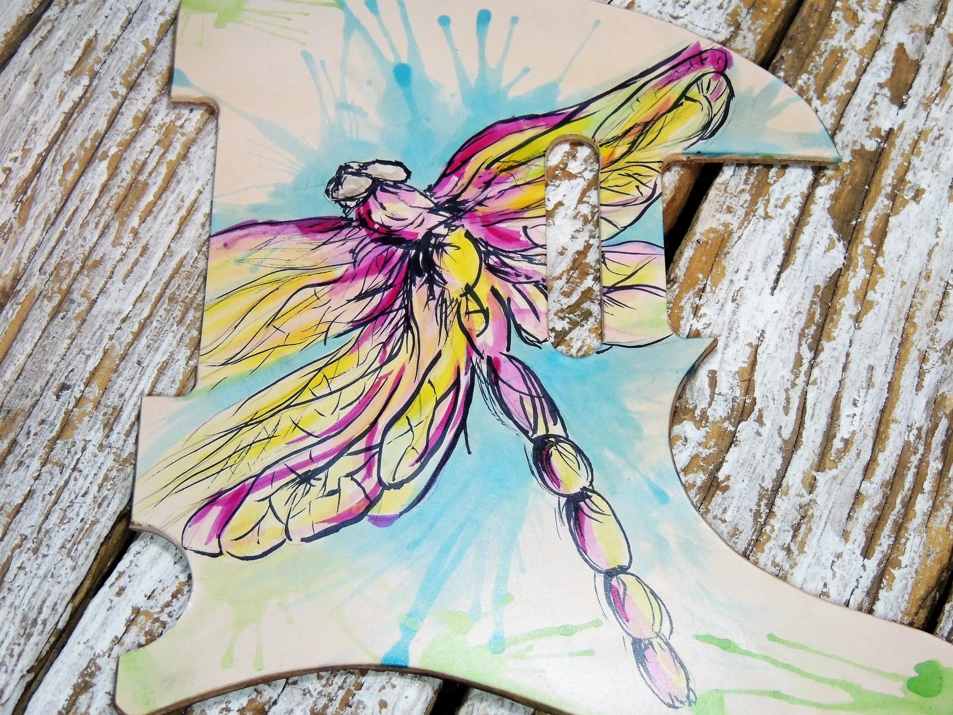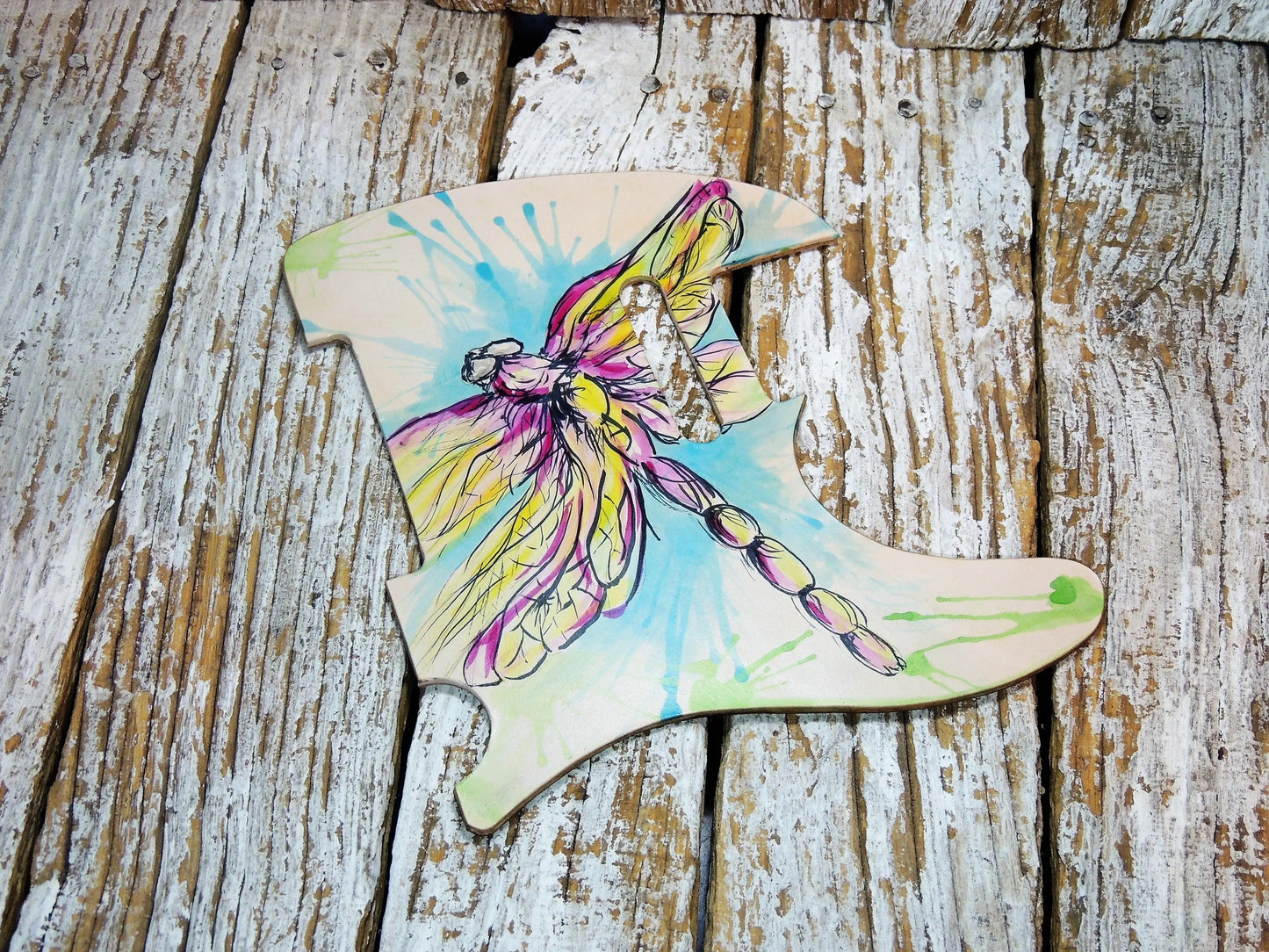 Dragonfly Leather Telecaster Pickguard, made with full grain leather which we painted. We have painted a dragonfly on light tan leather. We have beveled the edges of this pickguard and burnished them with beeswax and added some hard backing.