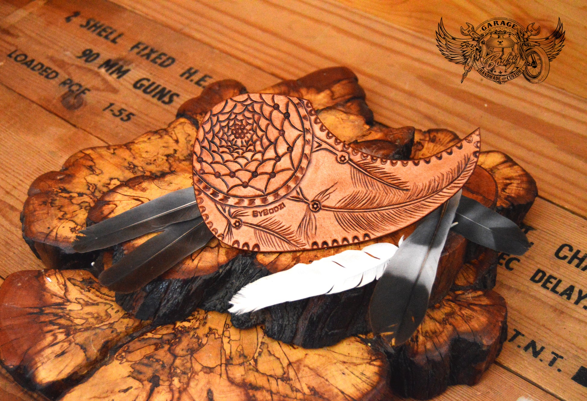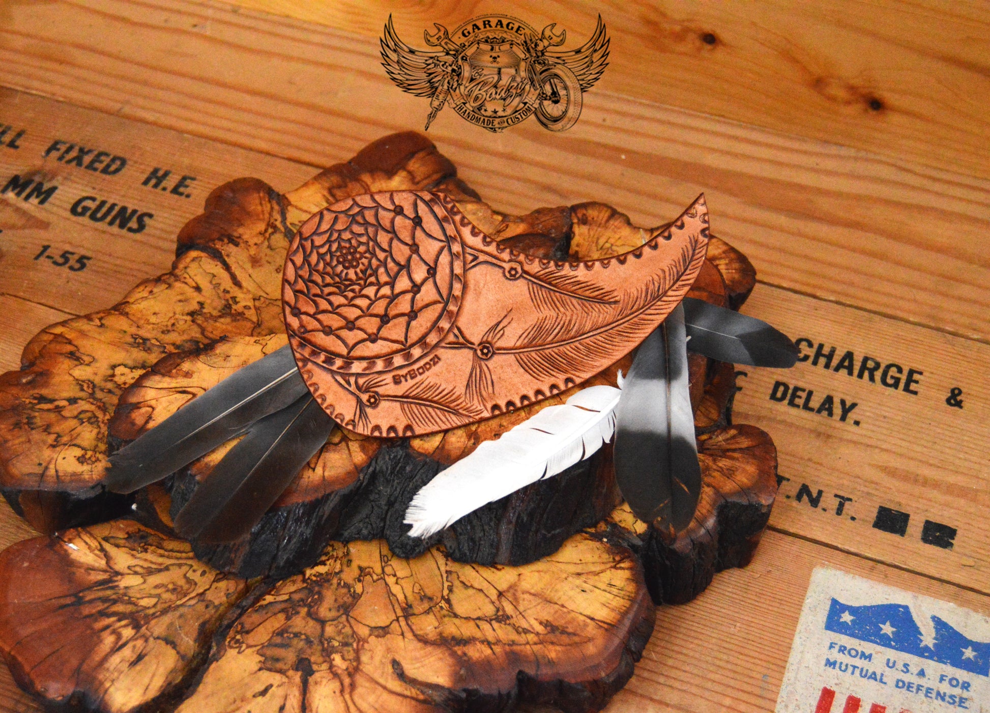Dream Catcher With Feathers Acoustic Guitar Pickguard, made with full grain leather which we hand tooled. This pickguard has a tooled dreamcatcher with a couple of feathers. We have beveled the edges of this pickguard and burnished them with beeswax.