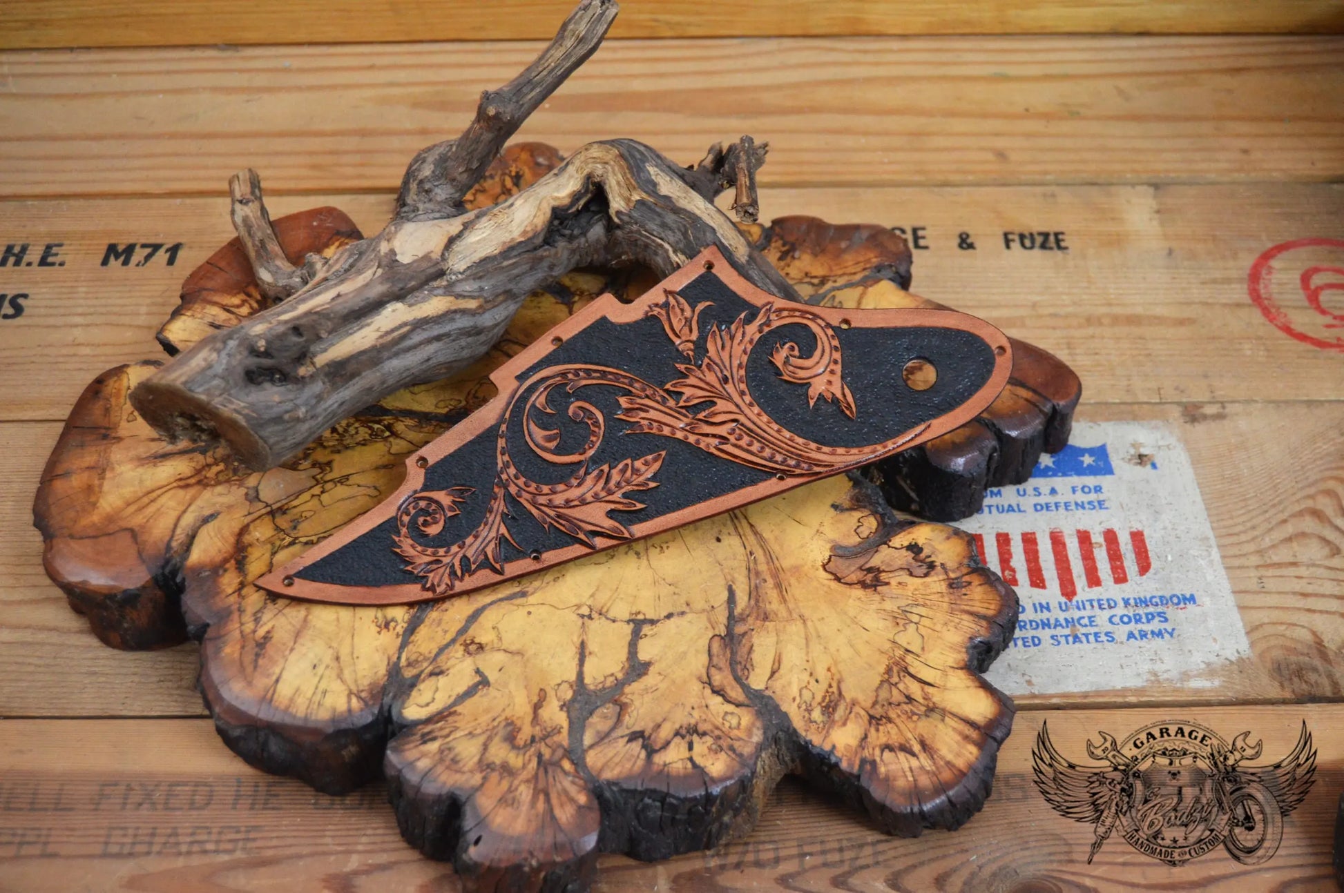 Floral Gibson Firebird Studio Pickguard, made with full grain leather which we hand tooled. We painted the background of this pickguard black while the tooled floral design and border have antique finish. We have beveled the edges of this pickguard and burnished them with beeswax and added some hard backing.