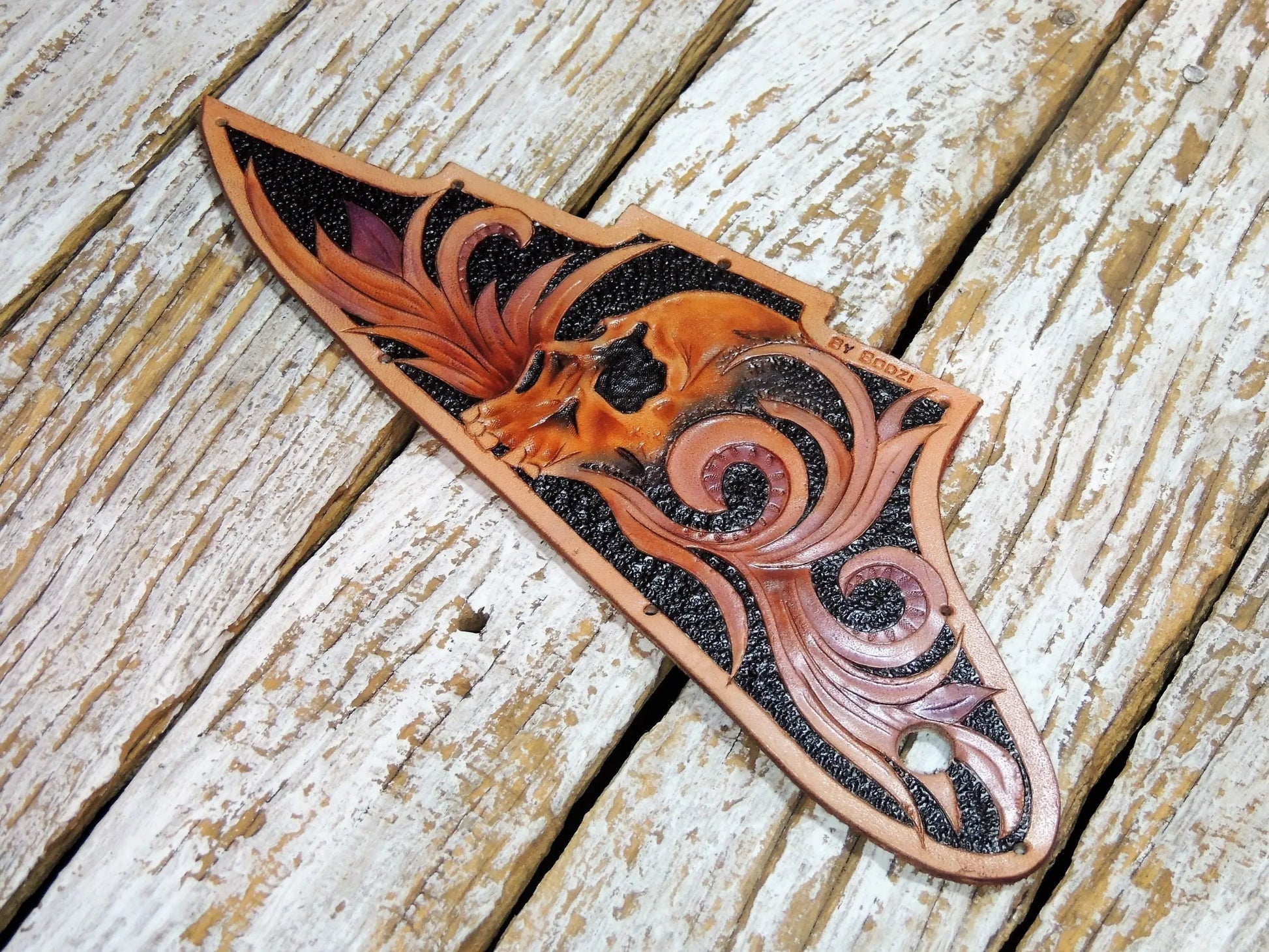 Floral Skull Gibson Firebird Studio Pickguard, made with full grain leather which we hand tooled. We painted the background of this pickguard black, the tooled skull is shaded brown while the floral design is purple. We have beveled the edges of this pickguard and burnished them with beeswax and added some hard backing.