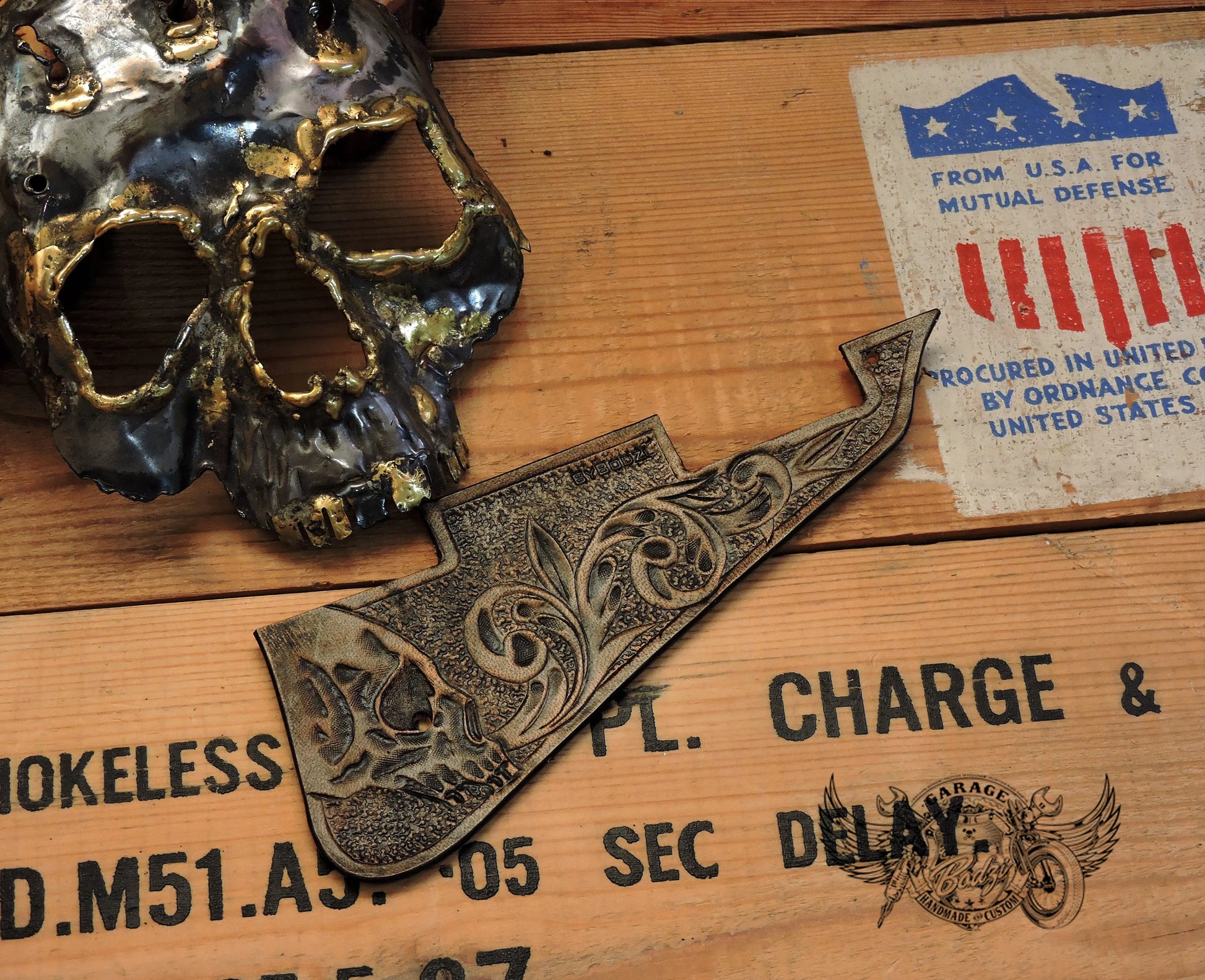 Floral Skull Gibson Les Paul Pickguard, made with full grain leather which we hand tooled. This pickguard has black finish on light tan leather. We have beveled the edges of this pickguard and burnished them with beeswax and added some hard backing.