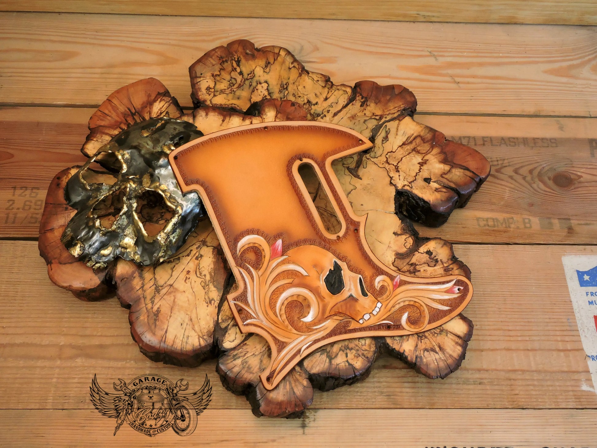 Floral Skull Leather Telecaster Pickguard, made with full grain leather which we hand tooled. Tooled skull with a floral design which we painted mostly in brown with black, red and white accents. We have beveled the edges of this pickguard and burnished them with beeswax and added some hard backing.