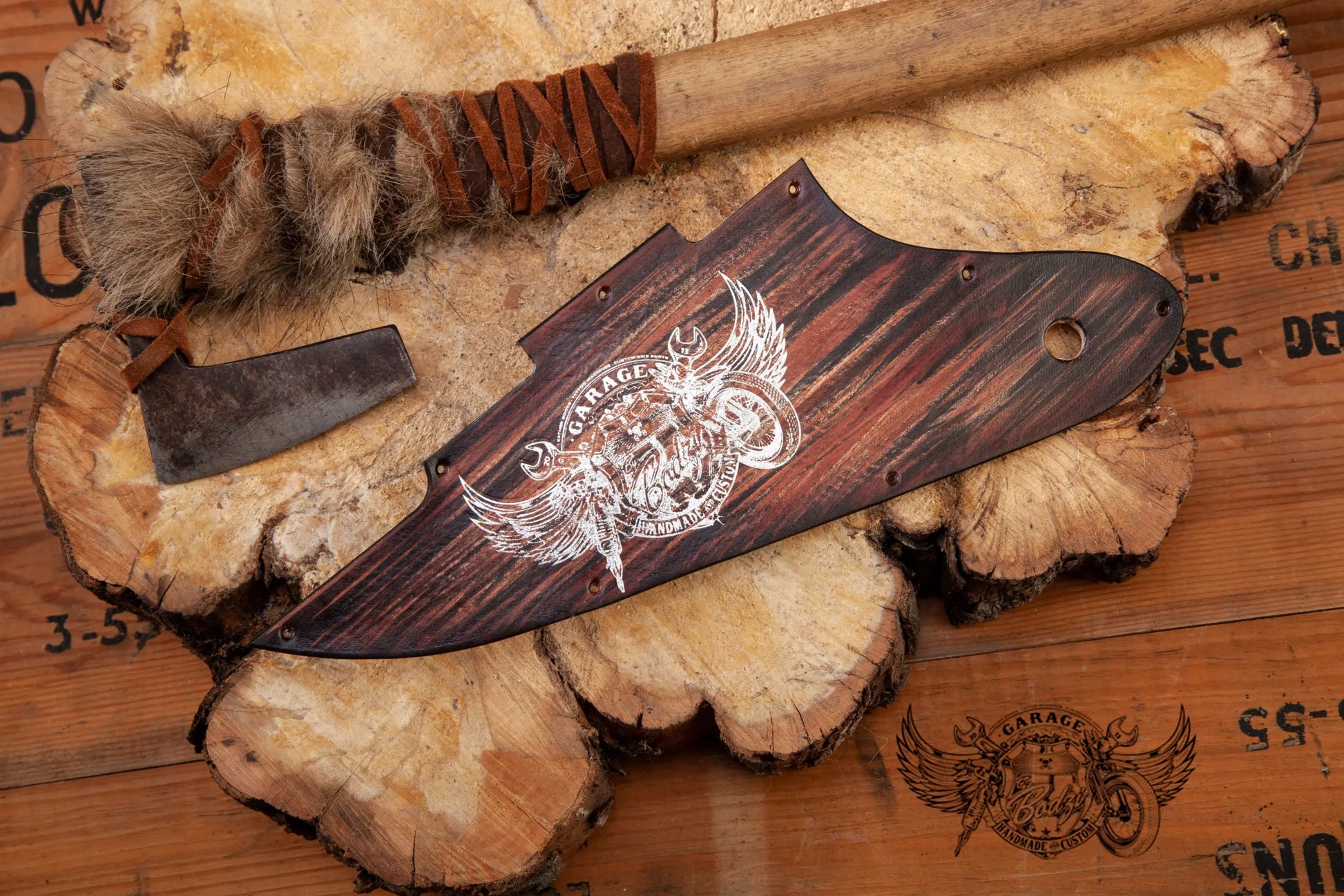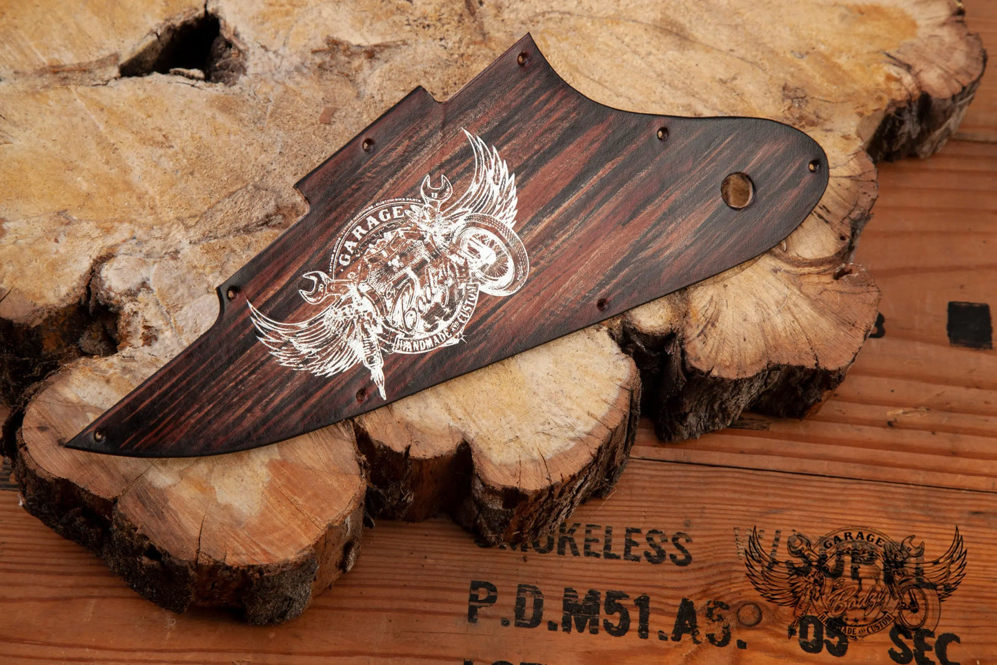 Gibson Firebird Studio Pickguard, made with full grain leather which we painted. This pickguard is painted in black and brown variations. We have beveled the edges of this pickguard and burnished them with beeswax and added some hard backing.