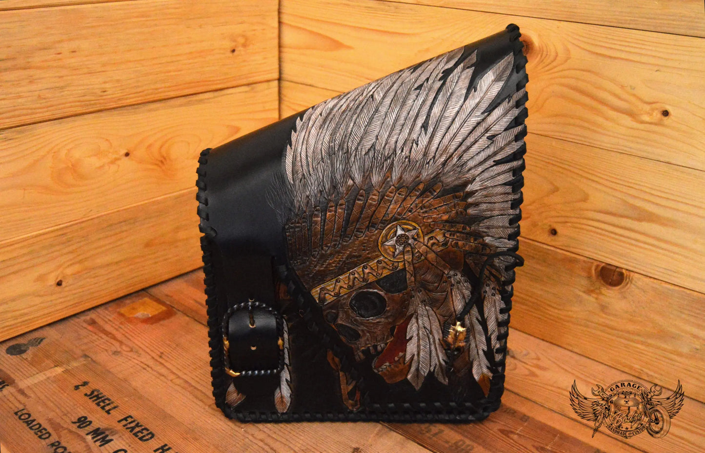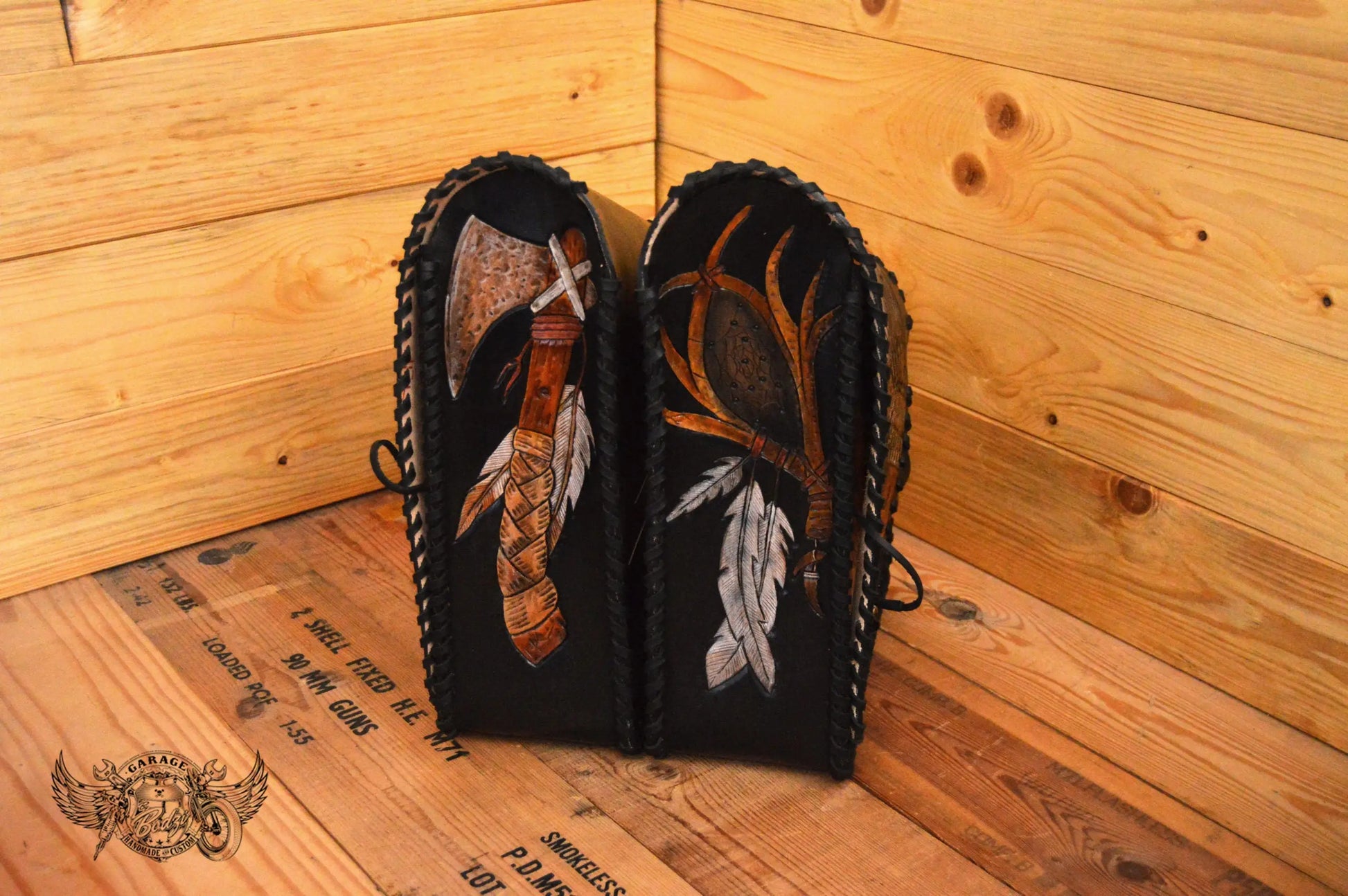 Indian Chief Carved Leather Motorcycle Saddlebags, made with full grain leather which we hand tooled. We tooled something unique on every side of these bags, painted the background black as base and fully painted every motif we tooled. After we've hand stitched everything we also added some leather lace. All the buckles and metal parts are hand crafted and if someone wonders the peace pipe is functional.