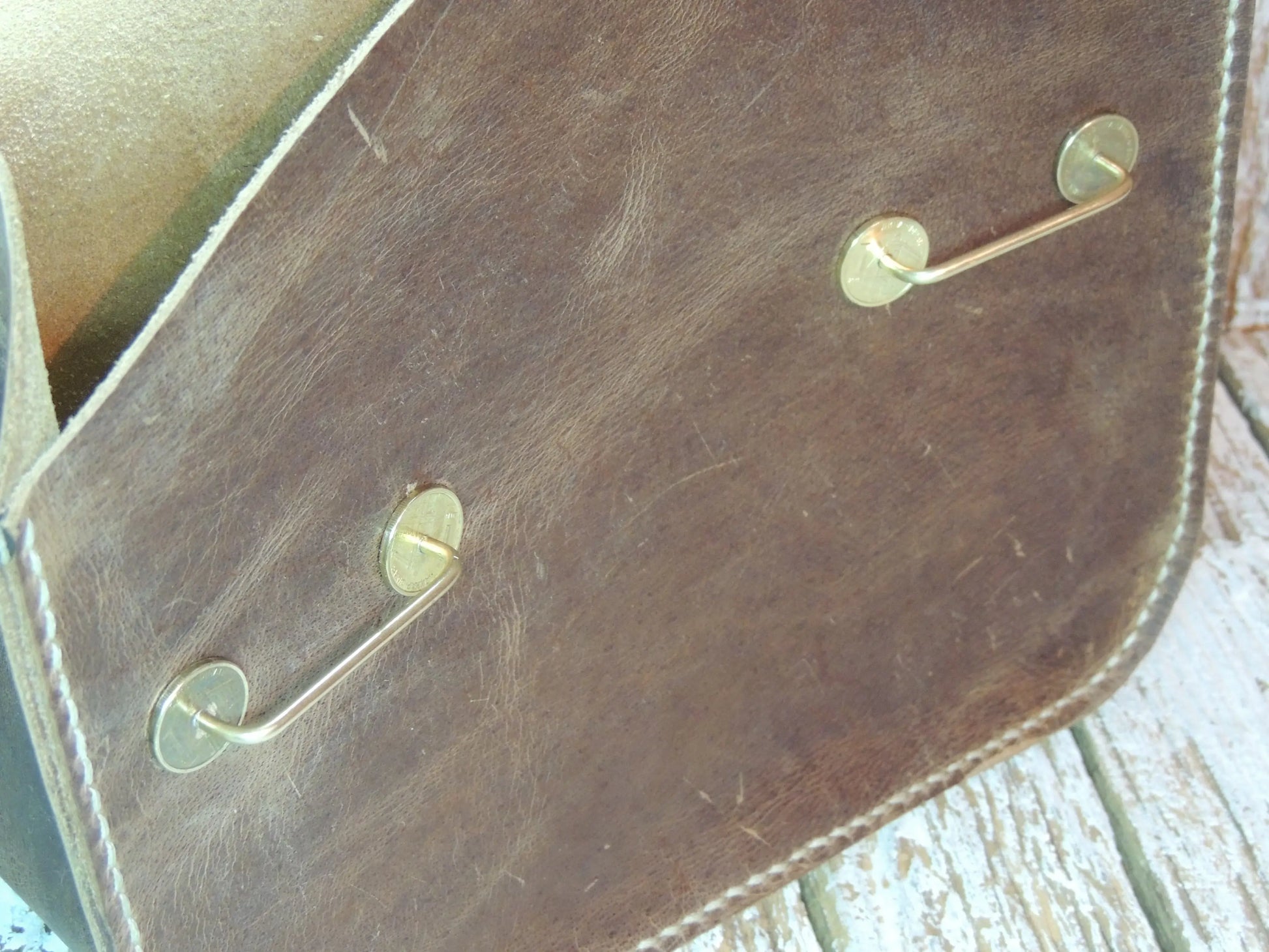 Leather Motorcycle Saddlebags, made with full grain leather. The bags close with straps which go through loops.