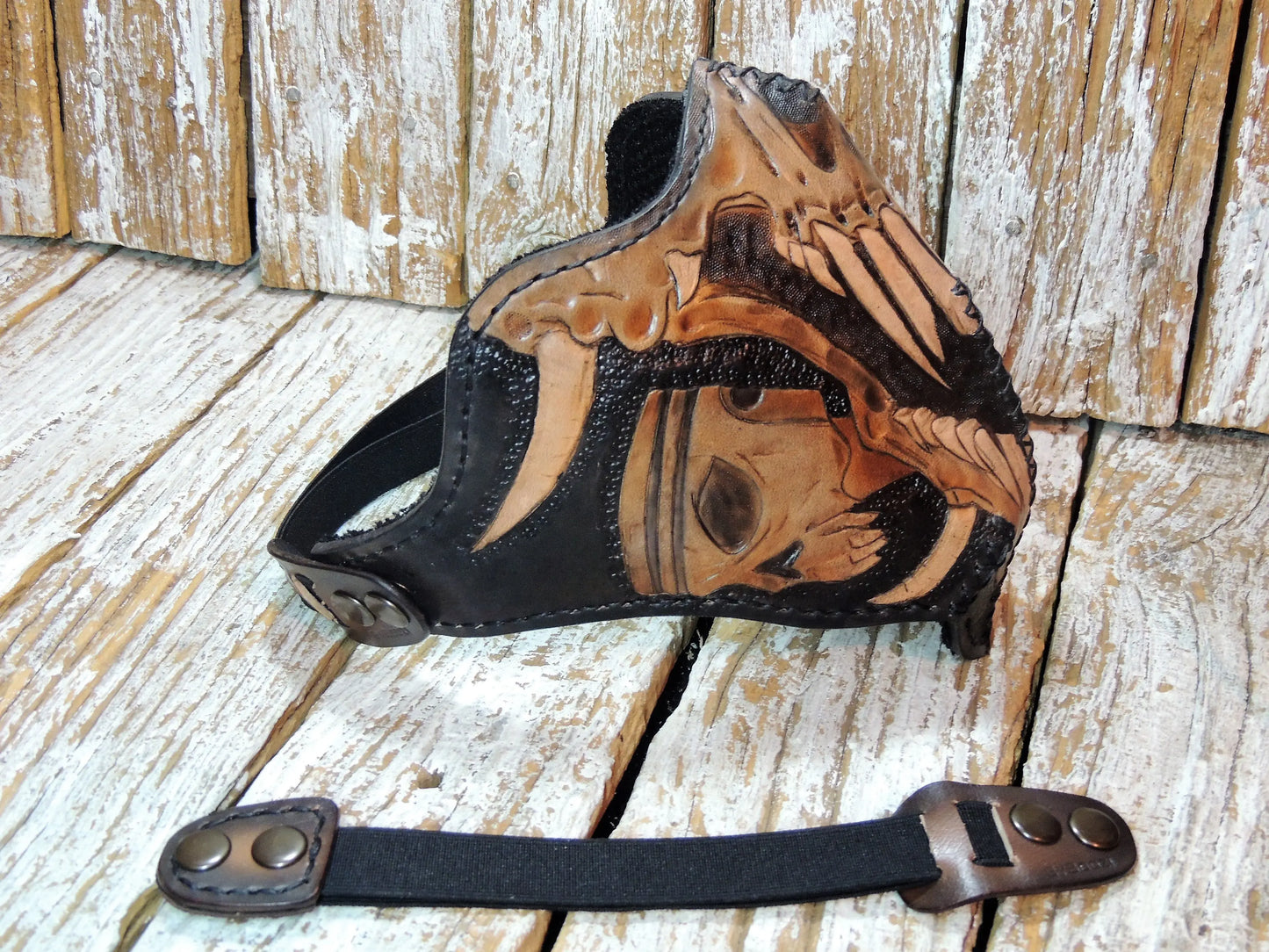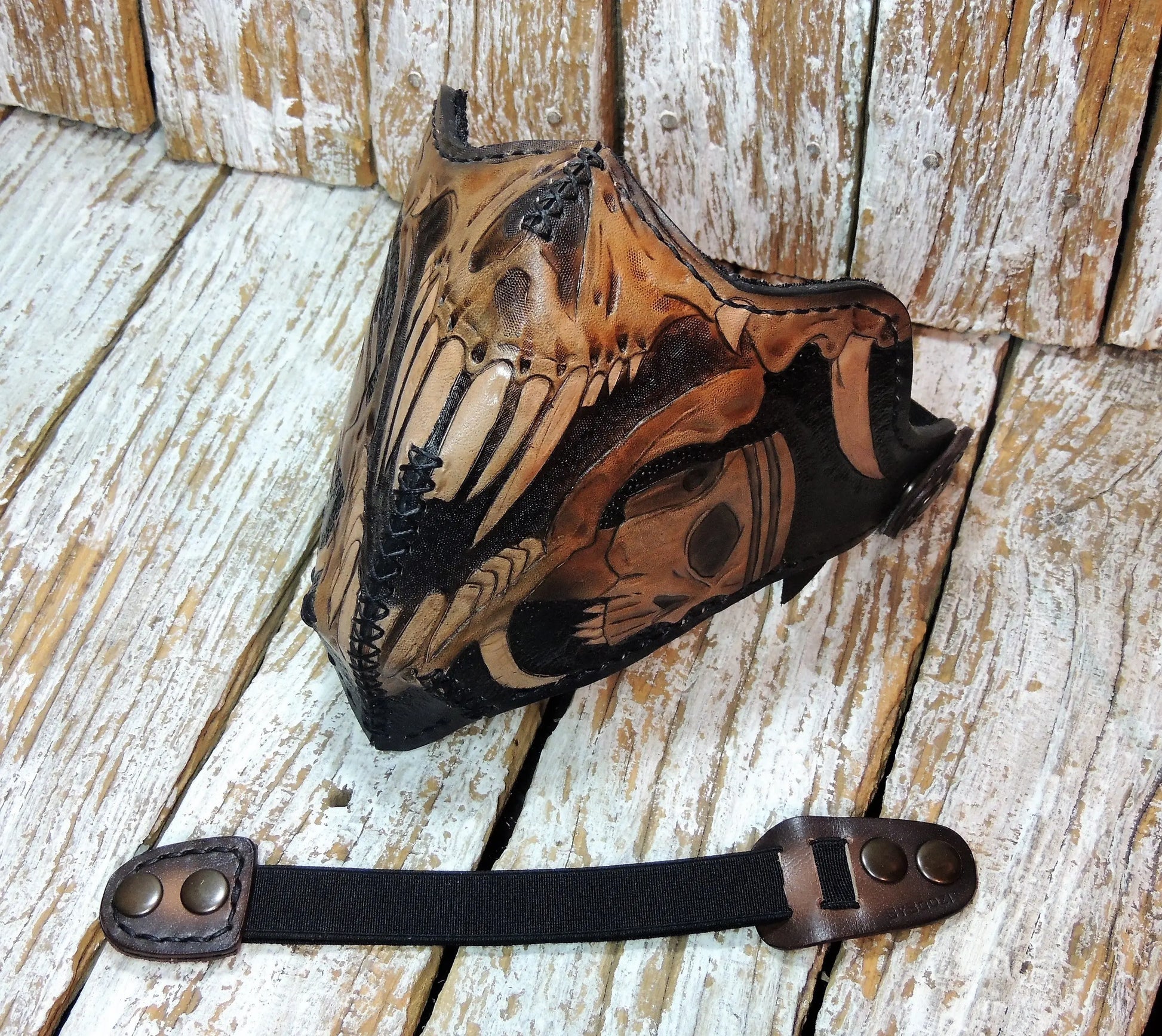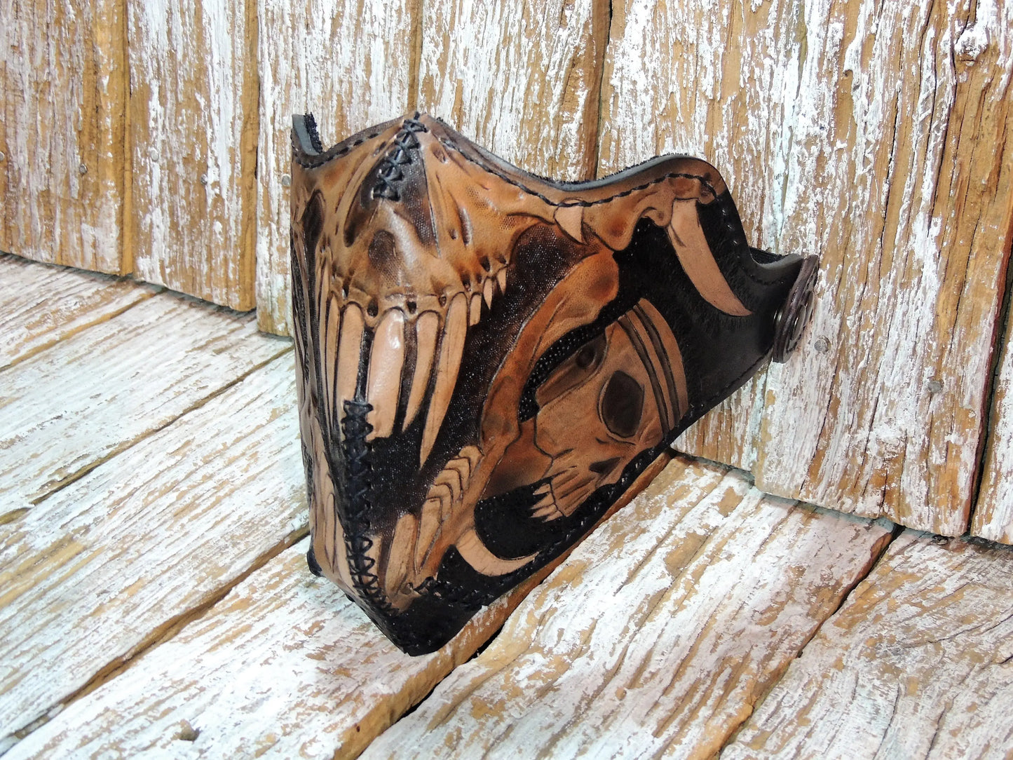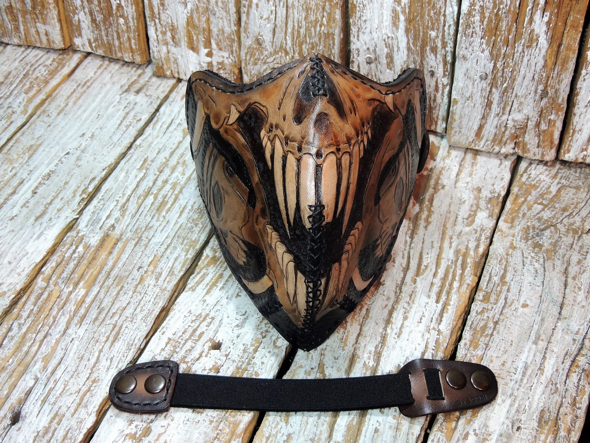 Monsters Skull Motorcycle Leather Half Mask, made with full grain leather which we hand tooled. We tooled and painted the mask completely to represent a skull of a monster. Inside of the mask is completely padded. We have beveled the outer edges of this half mask and burnished them with beeswax.