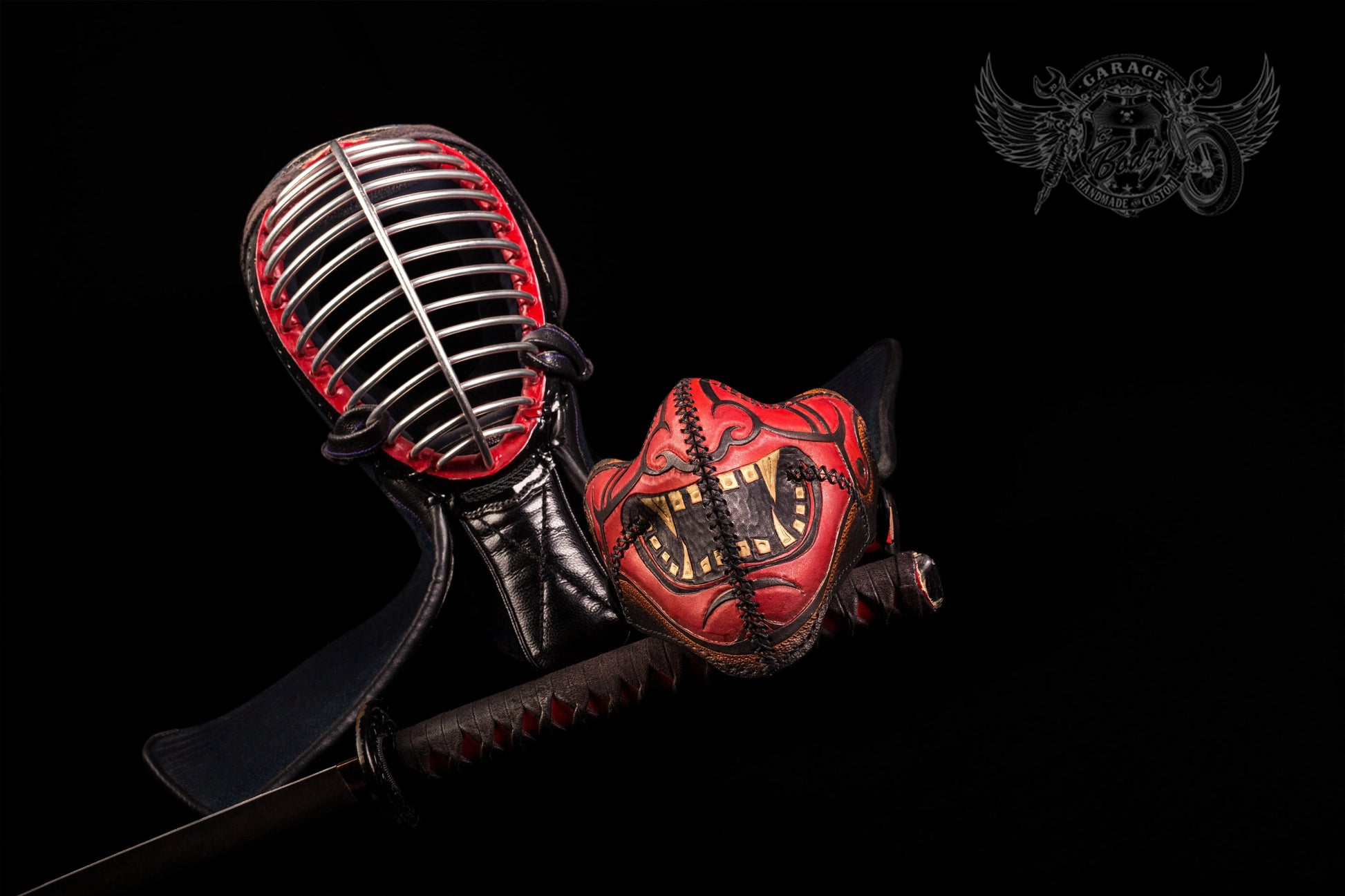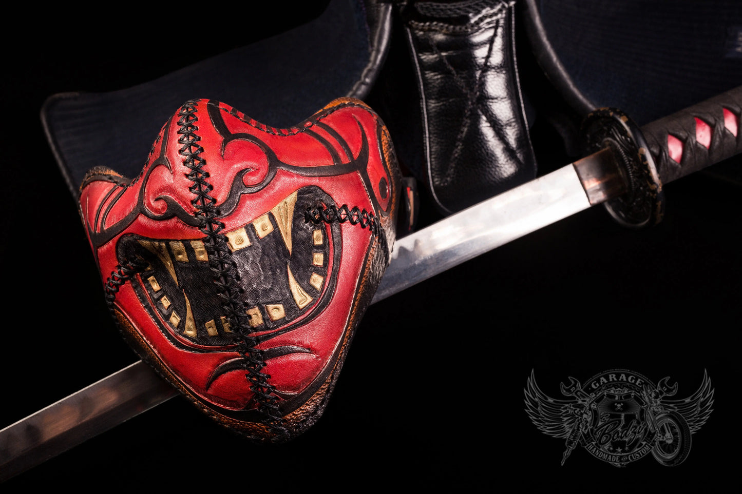 Oni Motorcycle Leather Half Mask, made with full grain leather which we hand tooled. We tooled and painted the mask completely to represent a Oni mask. Inside of the mask is completely padded. We have beveled the outer edges of this half mask and burnished them with beeswax.