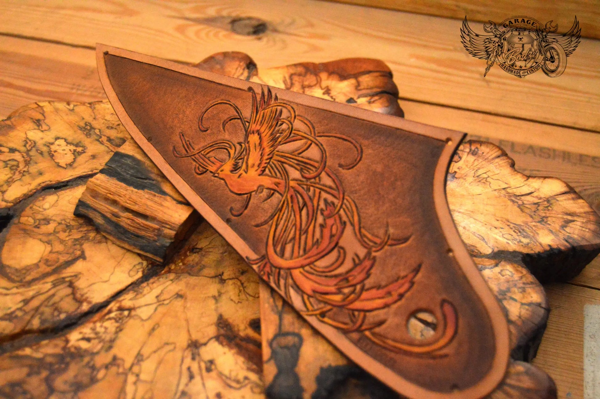 Phoenix Gibson Firebird Pickguard, made with full grain leather which we hand tooled. This pickguard is dyed dark brown with yellow and red phoenix. We have beveled the edges of this pickguard and burnished them with beeswax and added some hard backing.