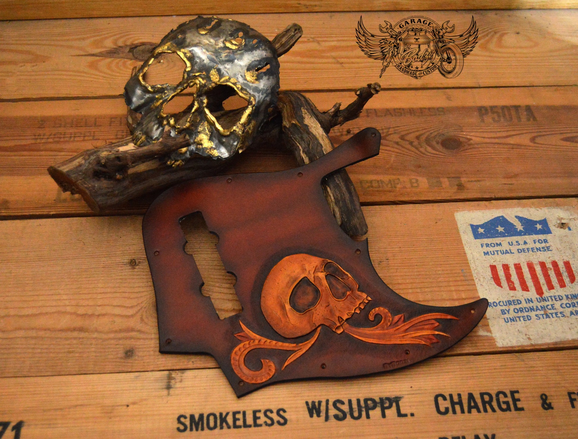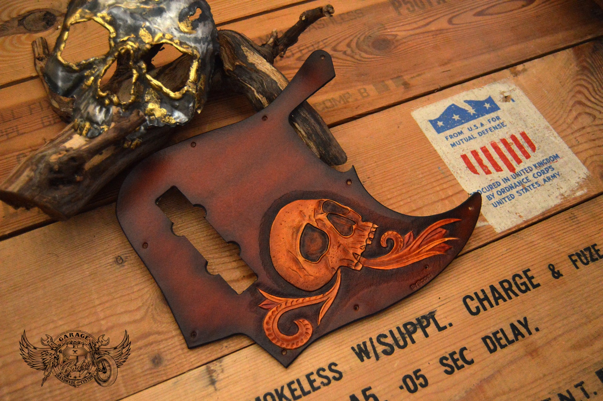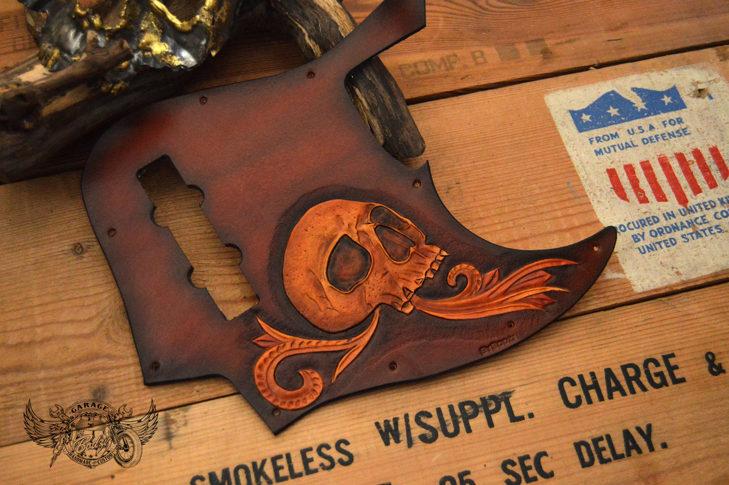 Red Skull Leather Fender Jazz Bass Pickugard, made with full grain leather which we hand tooled. Tooled skull with a bit of vinework on a dark red background with black shading. We have beveled the edges of this pickguard and burnished them with beeswax and added some hard backing.