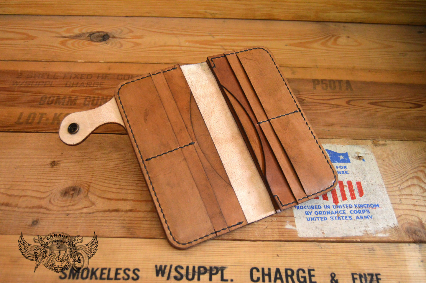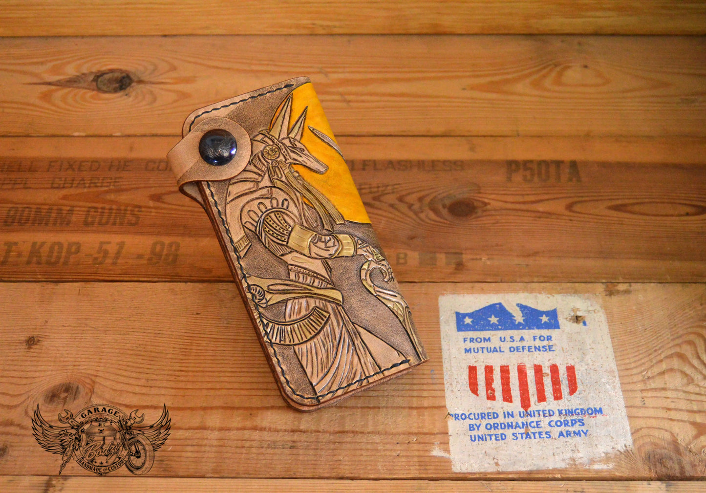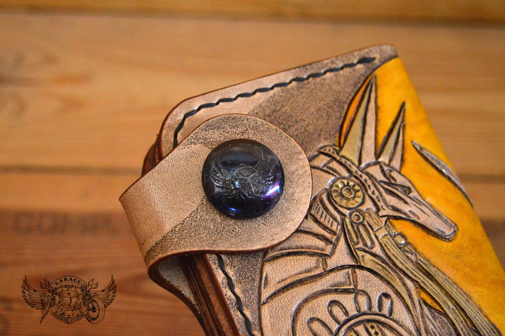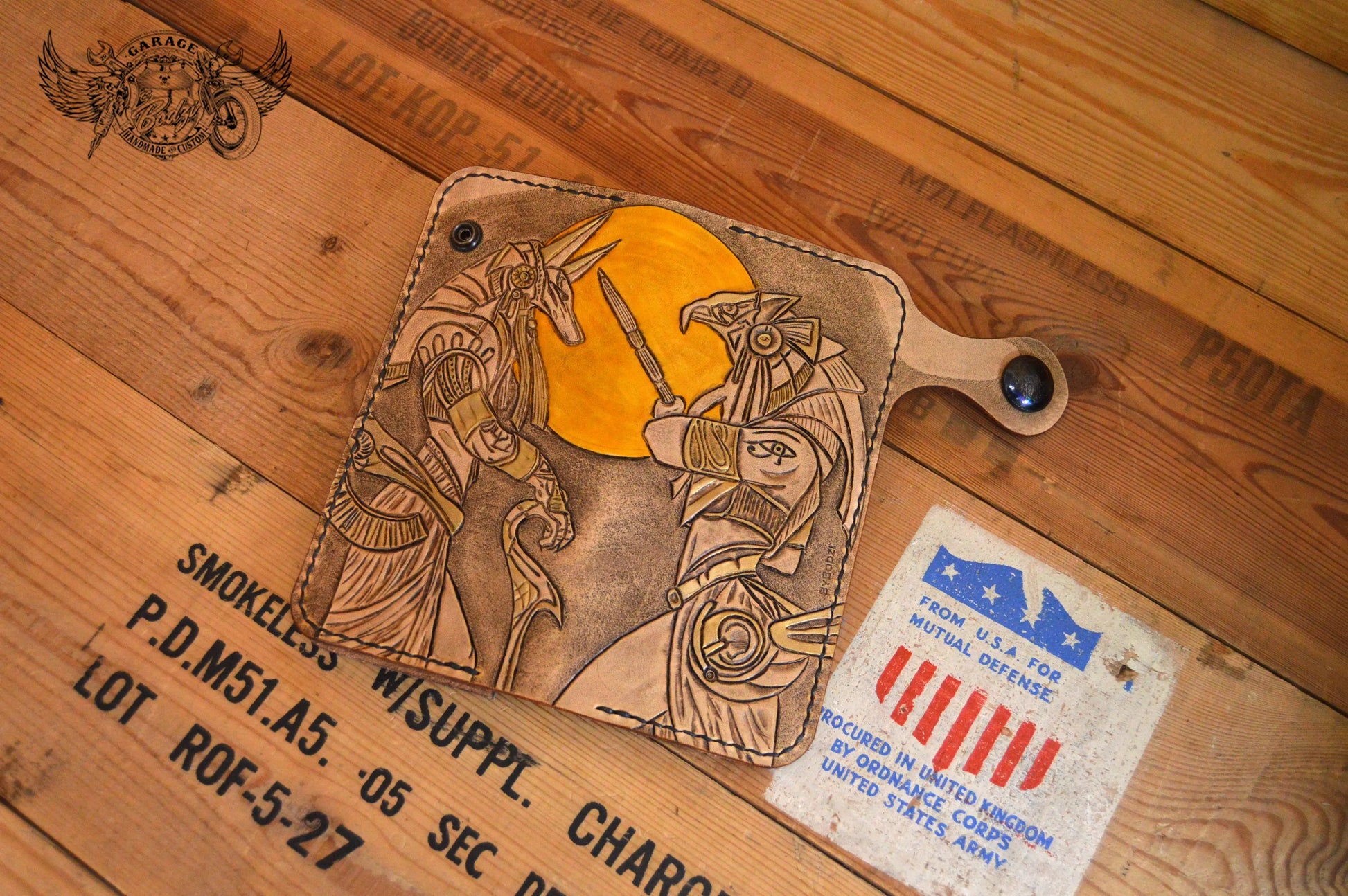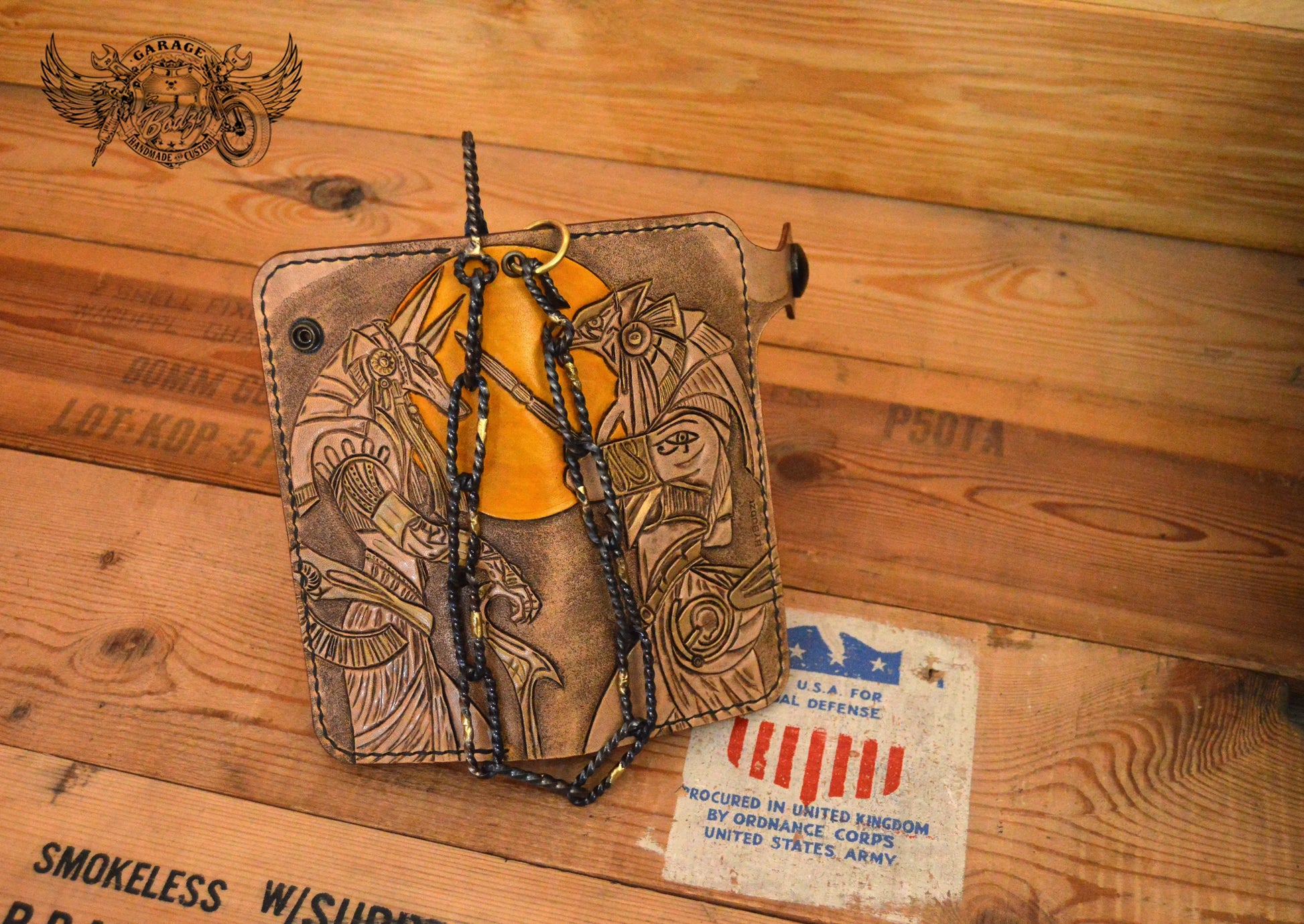 Seth & Horus Leather Long Leather Wallet, made with full grain leather which we hand tooled. We have tooled Seth and Horus in front of a sun with gold detail and antique brown finish. This wallet comes with a hand crafted concho which is engraved. We have beveled the outer edges of this wallet and burnished them with beeswax.