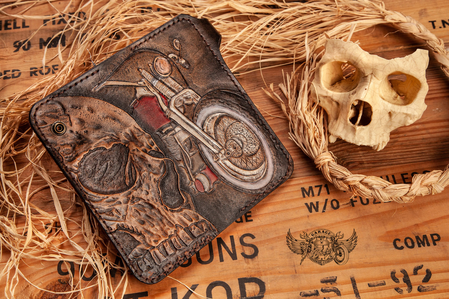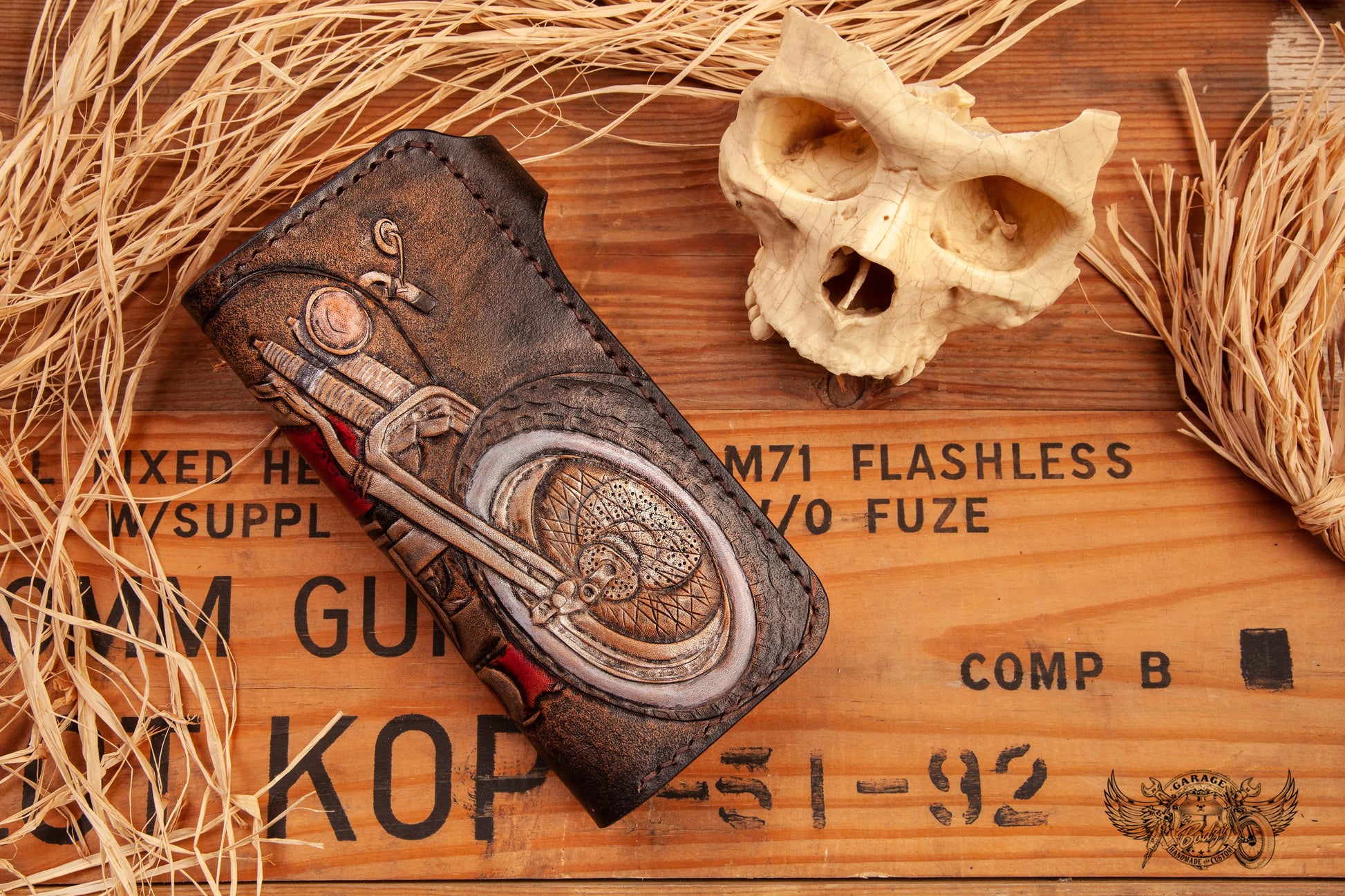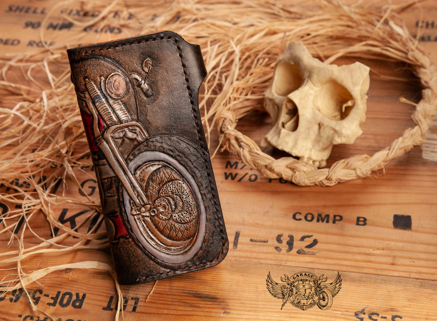 Skull & Bike Leather Long Leather Wallet, made with full grain leather which we hand tooled. On a wallet which is mostly brown we tooled a skull and a red custom bike. This wallet comes with a hand crafted concho which is engraved. We have beveled the outer edges of this wallet and burnished them with beeswax.