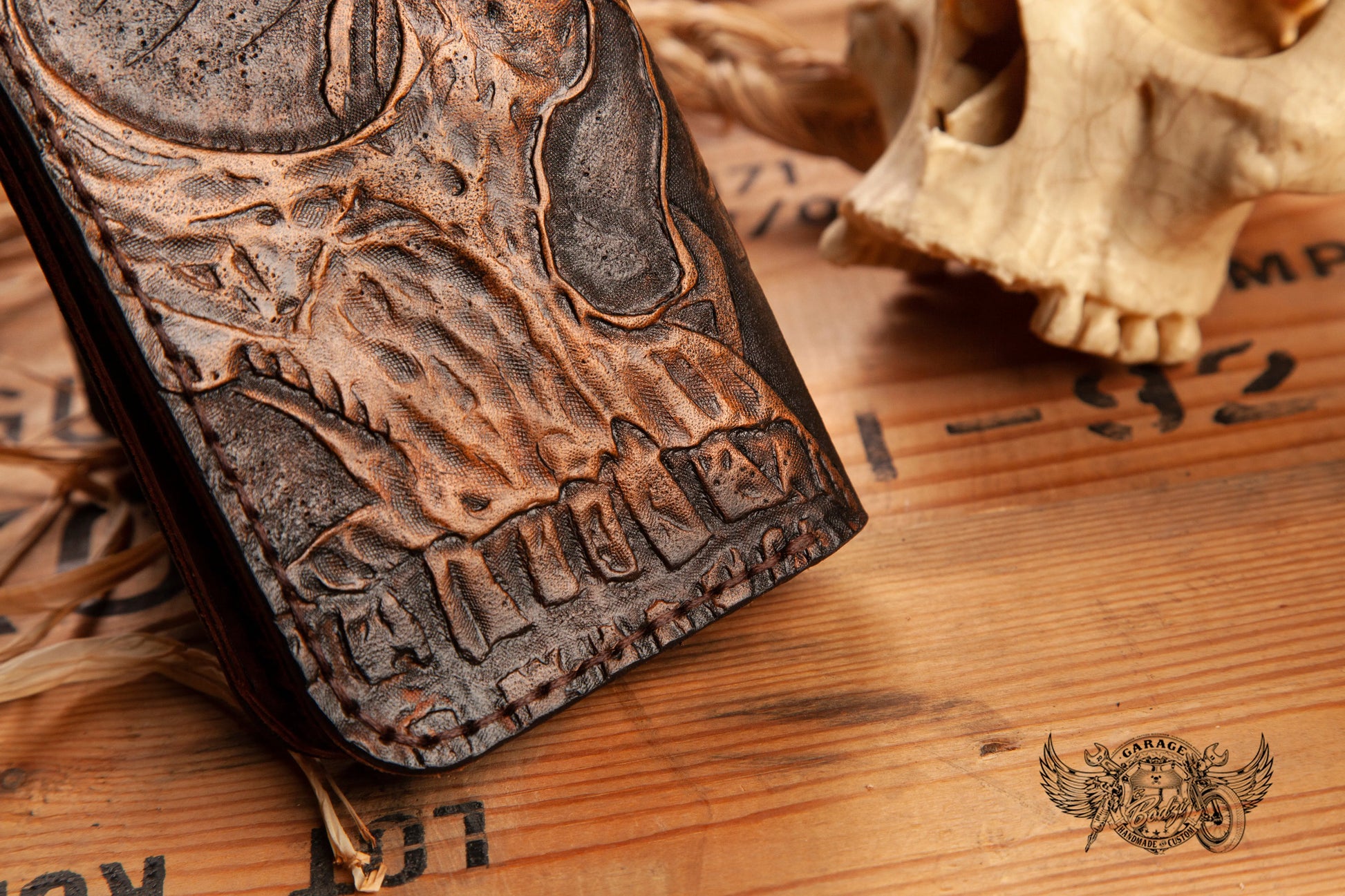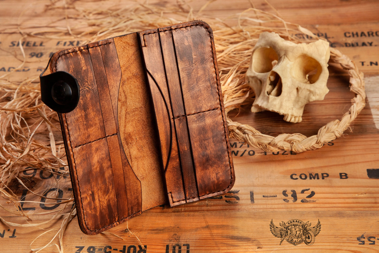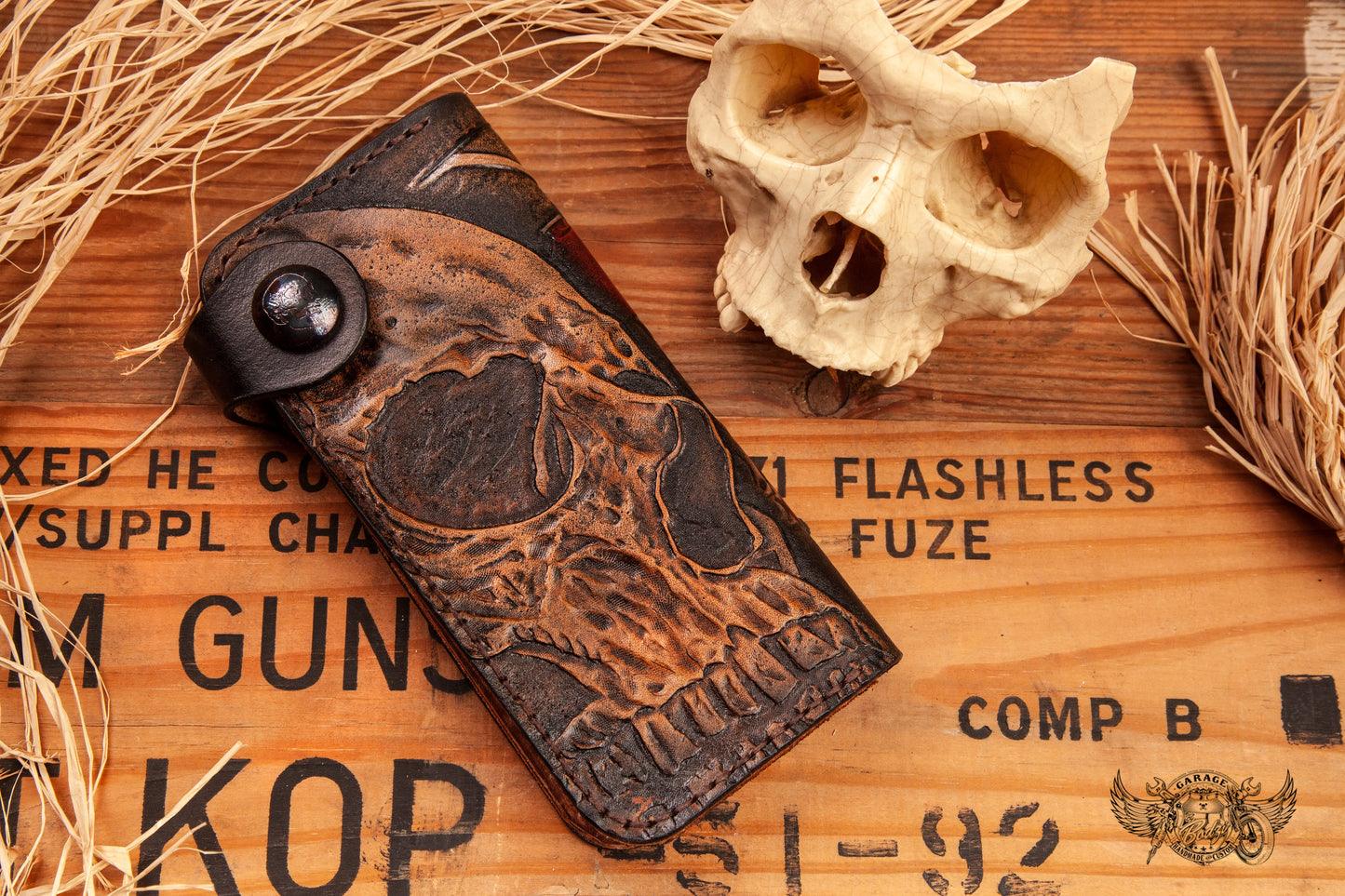 Skull & Bike Leather Long Leather Wallet, made with full grain leather which we hand tooled. On a wallet which is mostly brown we tooled a skull and a red custom bike. This wallet comes with a hand crafted concho which is engraved. We have beveled the outer edges of this wallet and burnished them with beeswax.