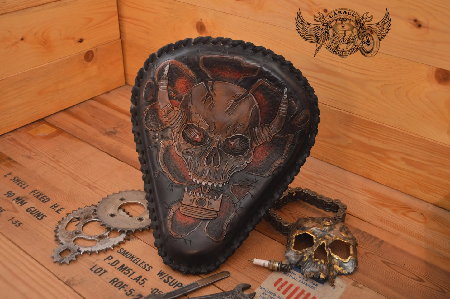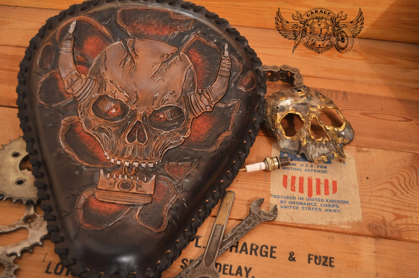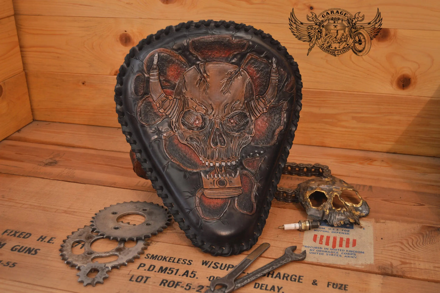 Skull & Piston Leather Motorcycle Solo Seat, made with full grain leather which we hand tooled. We dyed this seat in darker colors mostly with fully colored carved motifs. It is stitched with black waxed thread and laced with leather lace afterwards. We made the pan out of 3 mm thick steel sheets and welded M8 bolts to it.