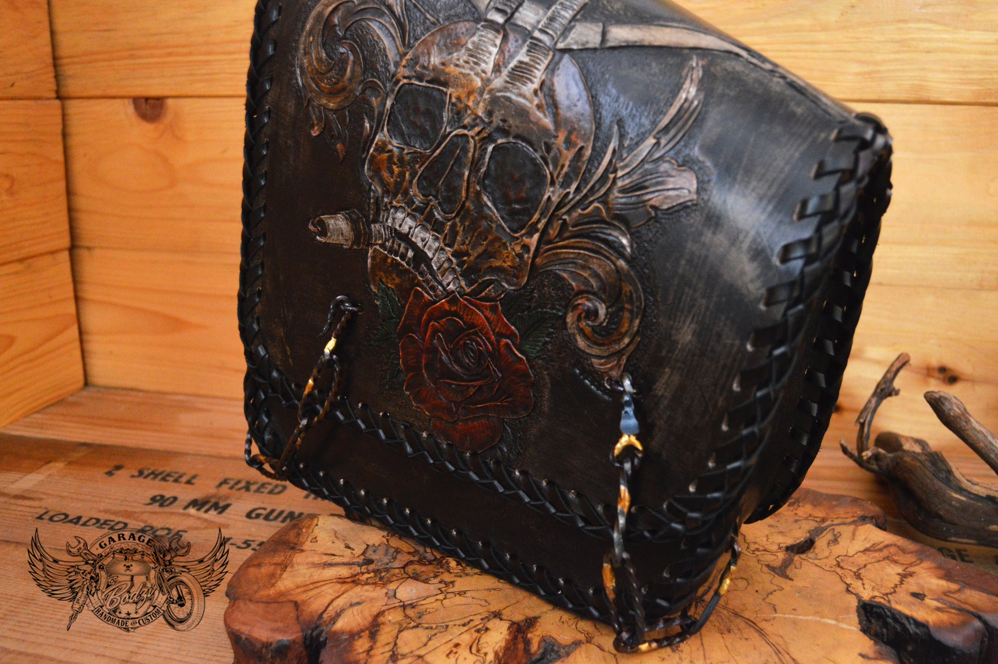 Skull & Piston Carved Leather Swingarm Bag, made from full grain leather which we hand tooled. This bag is fully carved with custom design. It is hand stitched with heavy duty waxed thread and laced afterwards. The chains and metal hooks are all hand crafted from steel.