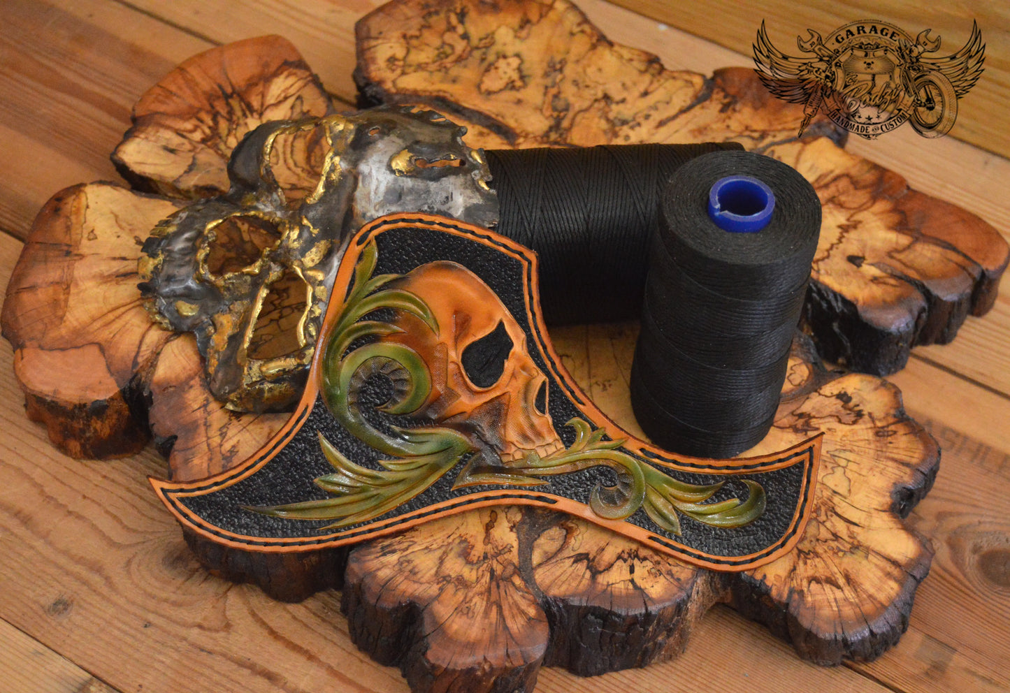 Skull & Vines Custom Leather Taylor Pickguard, made with full grain leather which we hand tooled. We tooled a skull with floral design on this pickguard and painted it in combination of green and black with brown shading. This pickguard also has some black decorative stitching. We have beveled the edges of this pickguard and burnished them with beeswax.