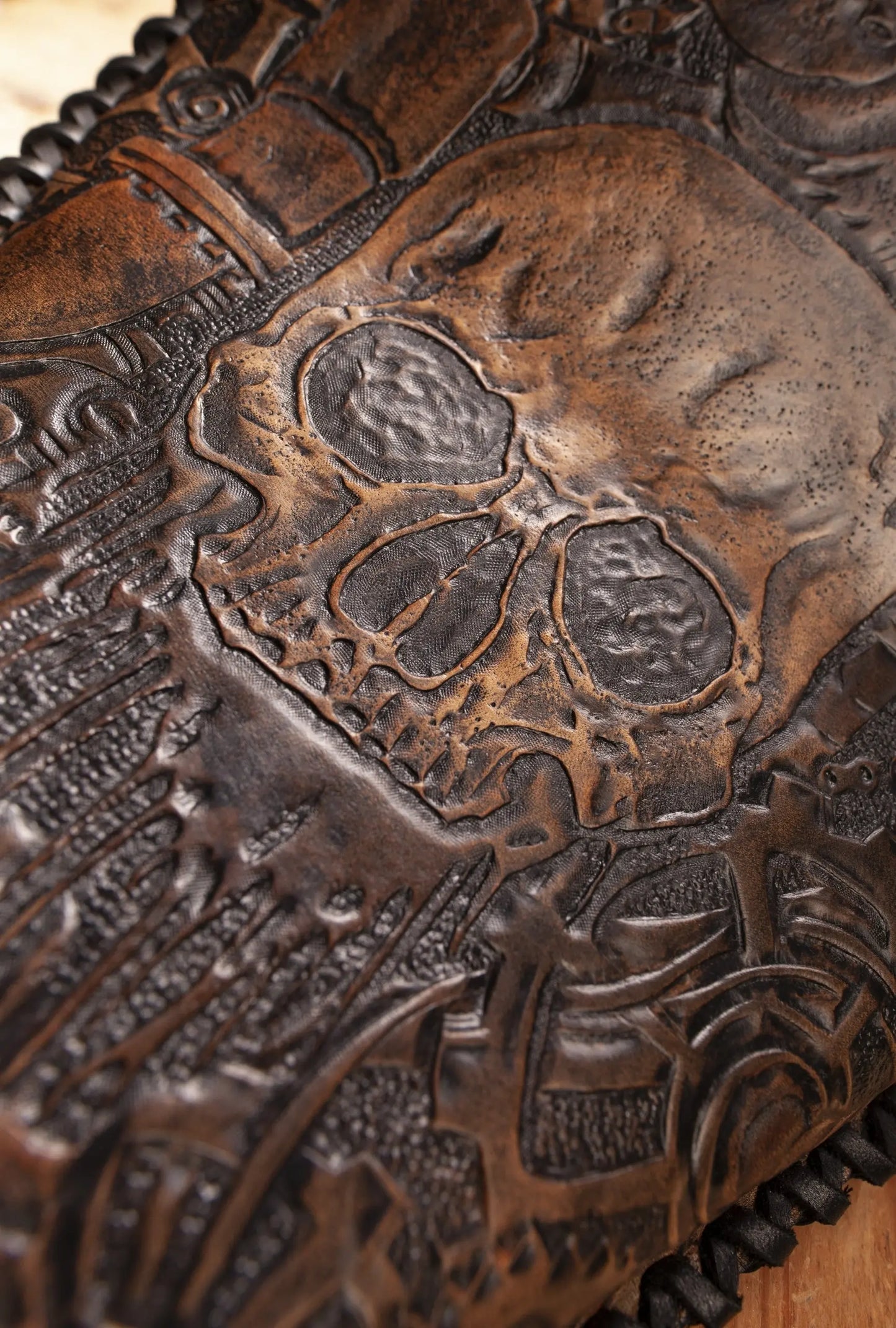 Steampunk Leather Motorcycle Solo Seat, made with full grain leather which we hand tooled. We carved this seat completely and did a black finish on it after shading certain details. It is stitched with black waxed thread and laced with leather lace. Bottom side is also covered with leather. Seat pan is hand crafted from 3mm thick steel sheet with welded on M8 bolts.