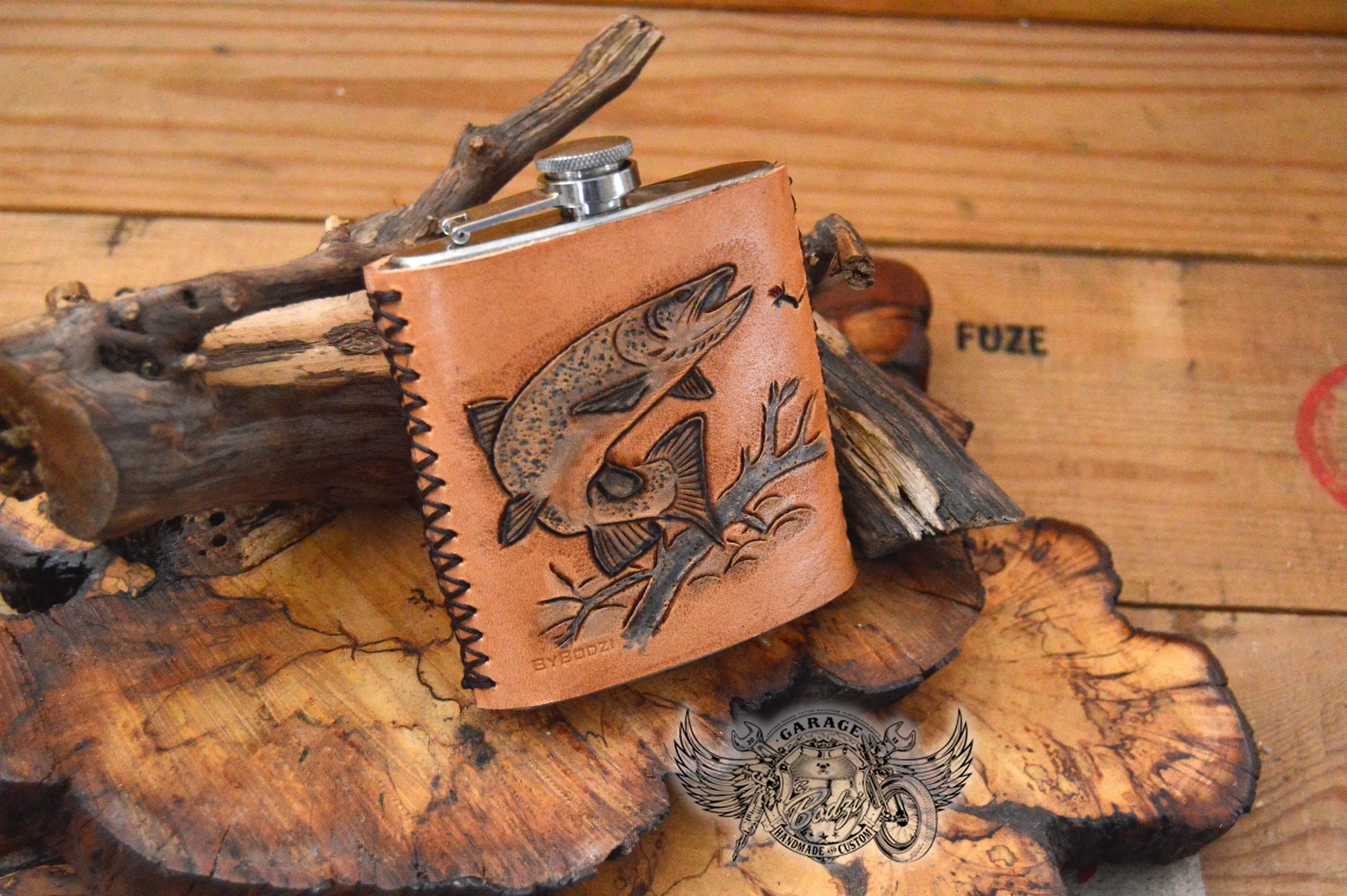 Trout Fish Leather Bound Flask made with full grain leather which we hand tooled. Trout which we tooled is fully painted while the background is in combination of tan and brown. We stitch the cover together using parchment brown waxed thread. The flask is stainless steel and has a capacity of 7 ounces.