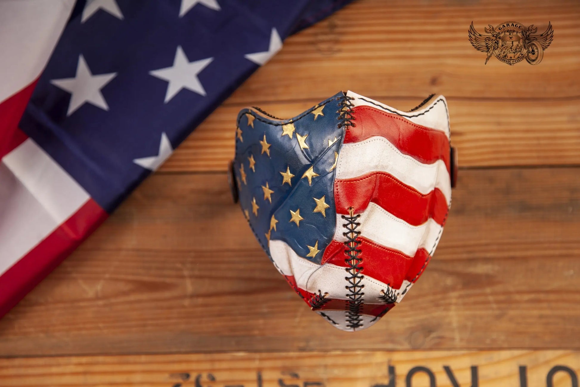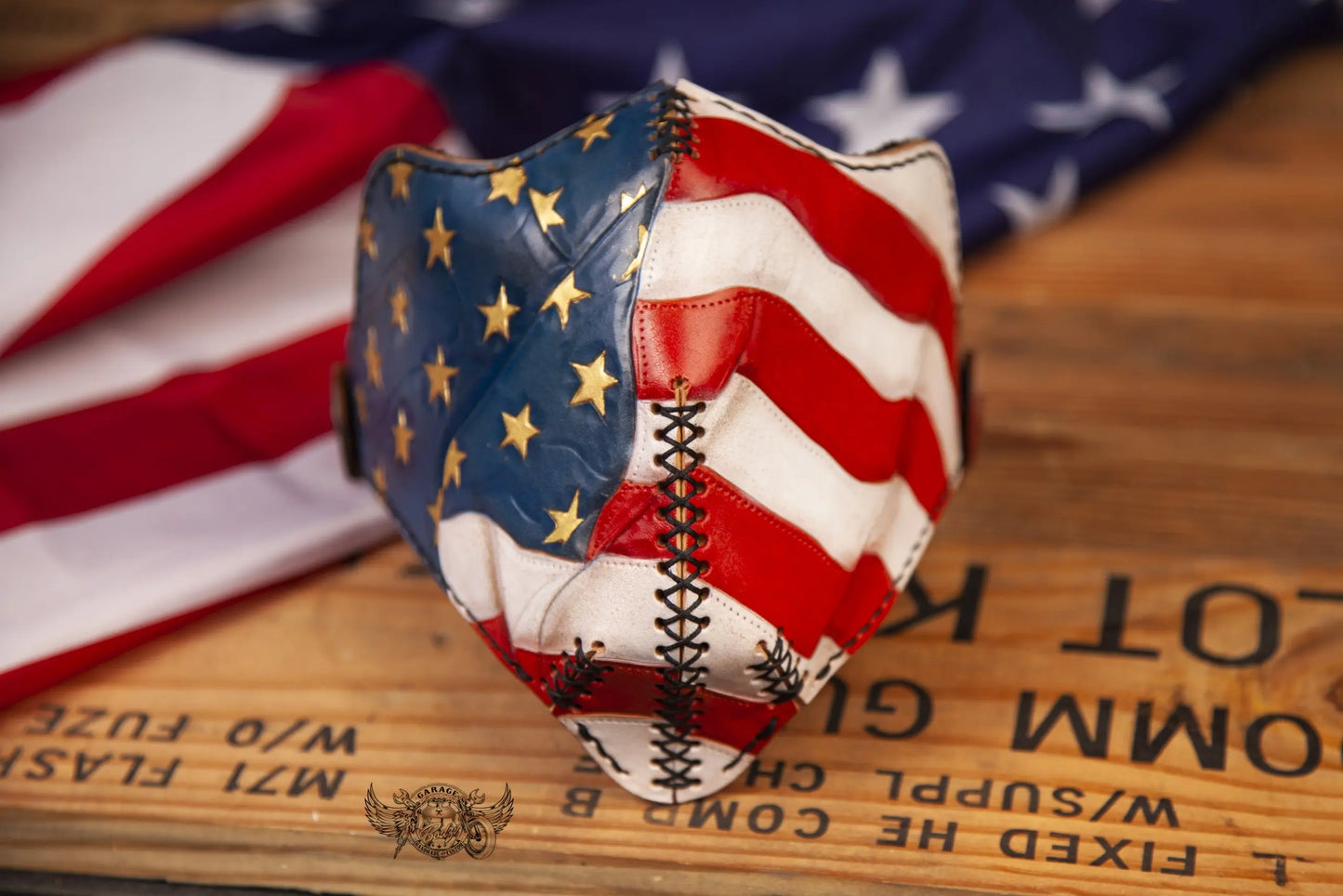 US Flag Motorcycle Leather Half Mask, made with full grain leather which we hand tooled. We tooled the mask completely and painted it to represent US flag, the stars are gold plated using gold leaves. Inside of the mask is completely padded. We have beveled the outer edges of this half mask and burnished them with beeswax.