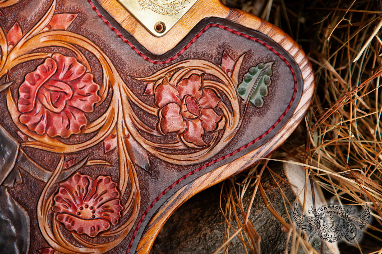 Western Floral Leather Bound Telecaster Body, made with full grain leather which we hand tooled. We made and tooled inserts of leather on the back and front. This pickguard, as any other, is mounted with screws and can be removed. The red stitching which goes around every leather piece is just there for decoration, the pickguard is the only removable piece on this guitar. This guitar body also comes with handmade brass knobs, strap buttons and neck plate.