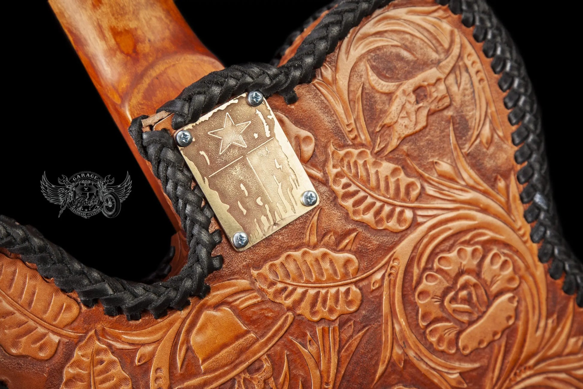 Western Leather Bound Telecaster Body, bound with full grain leather which we hand tooled. We completely encased the body in leather and carved it with custom western designs. Pickguard and control plate are made as cutouts and they come off normally. We laced all the edges of the body with black leather lace. This guitar body also comes with handmade brass knobs, strap buttons and neck plate.