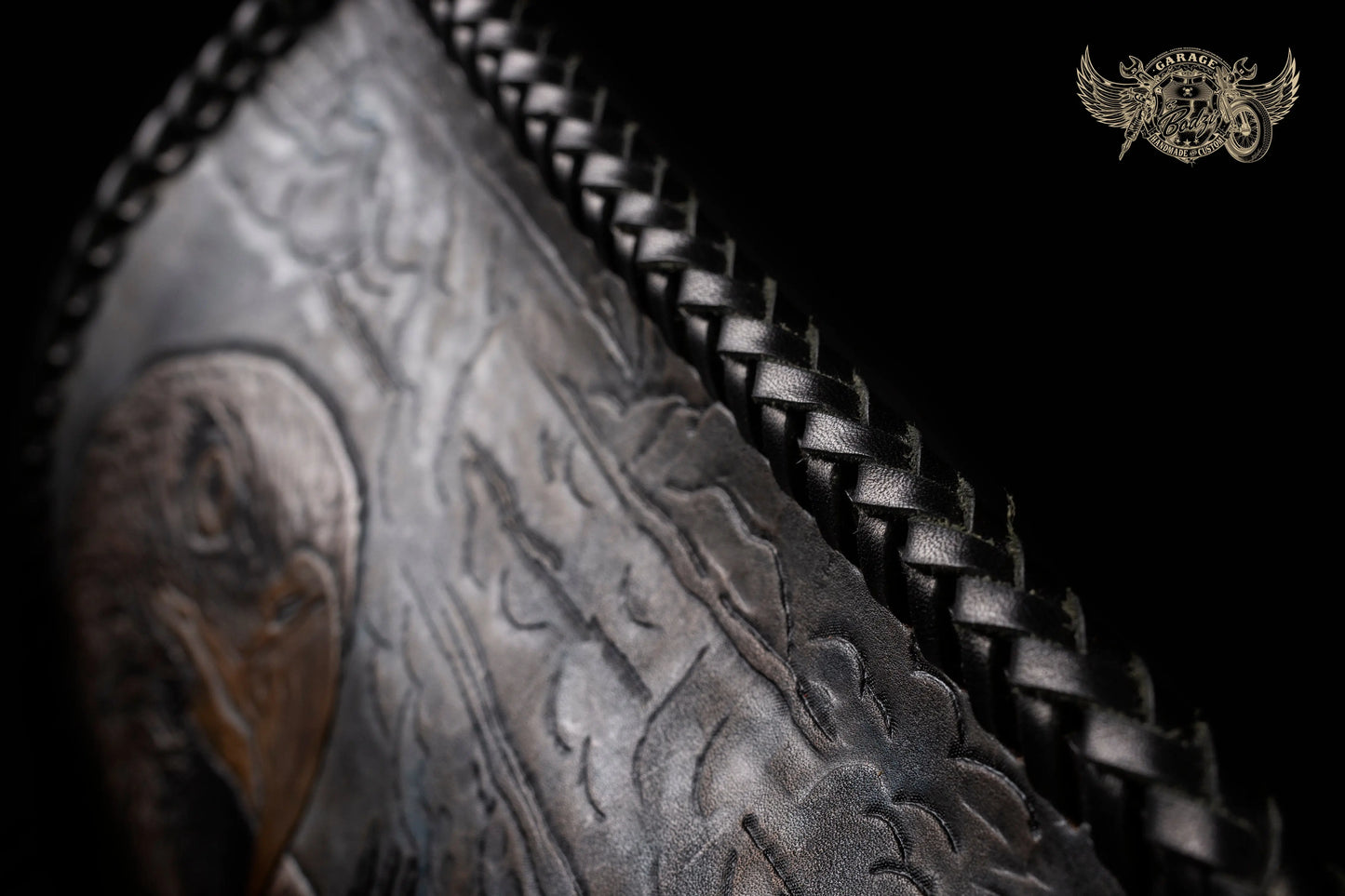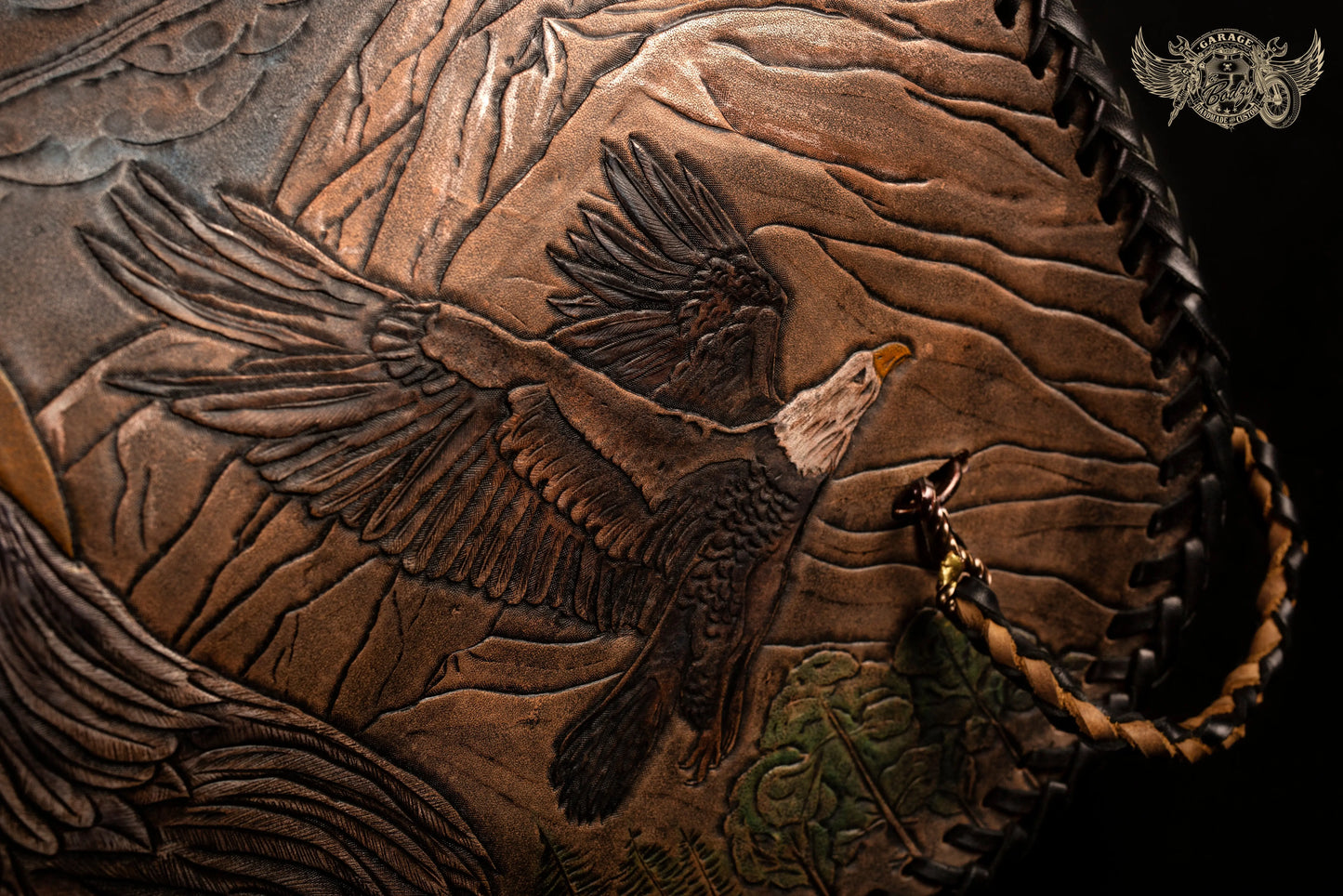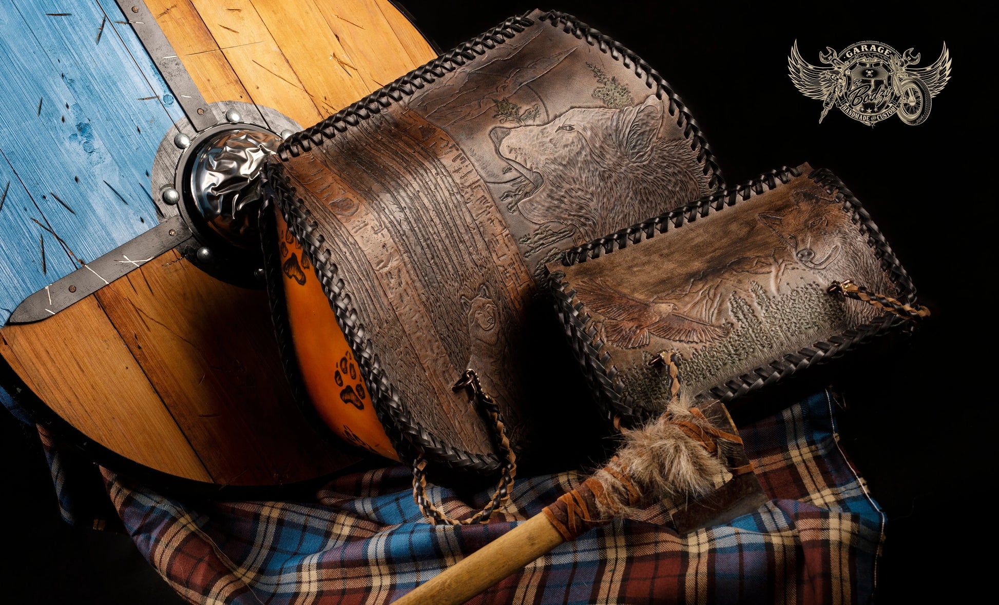 Wolf & Eagle Landscape Leather Motorcycle Saddlebags and Tool Bag, made from full grain leather which we hand tooled. We have decided just to tool the flaps on these bags while the rest is hand painted. Different landscapes are tooled on both bags including the tool bag. Whole bag is laced with black leather lace.